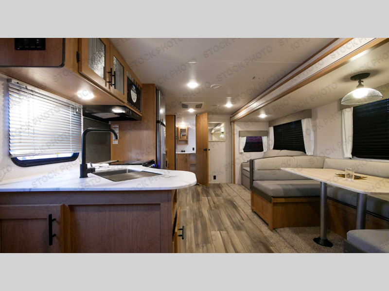 With any Avenger or Avenger LE travel trailer by Prime Time, the exterior includes an aerodynamic radius front profile, a diamond plate front rock guard for protection on the road, a power tongue jack for easy setup, and four stabilizer jacks. There is an aluminum exterior skin, a walk-on roof with decking, and an Extreme Weather package plus enclosed underbelly. The interior offers a 13,500 BTU air conditioner for the perfect climate inside, in-floor ducted heat, a systems monitor panel, and a Bluetooth entertainment system plus more depending on the travel trailer you choose to begin your outdoor adventure with.