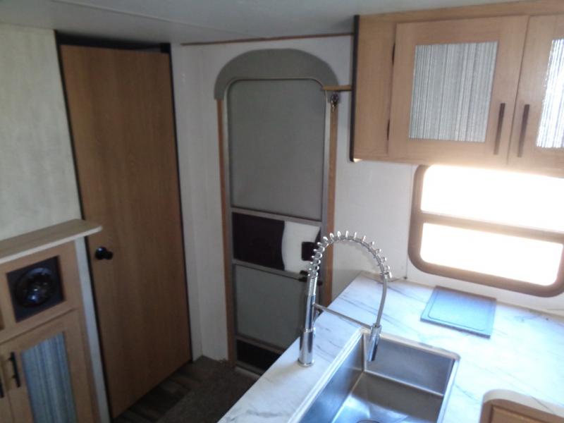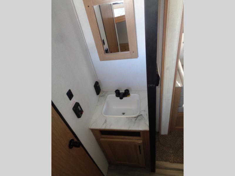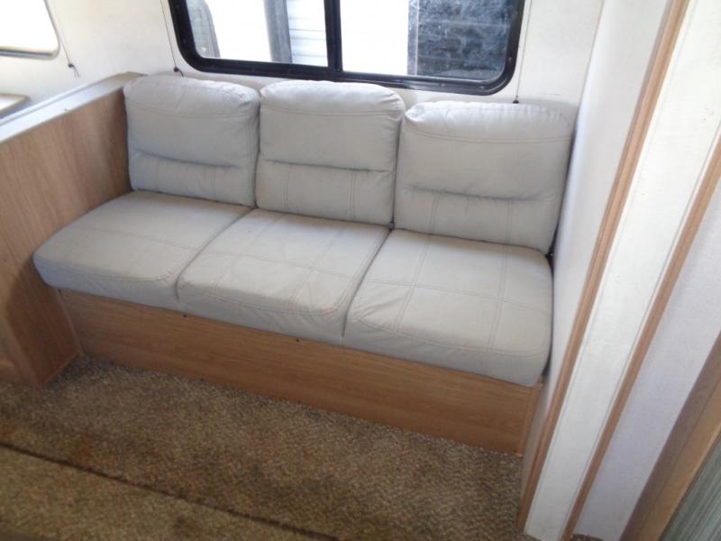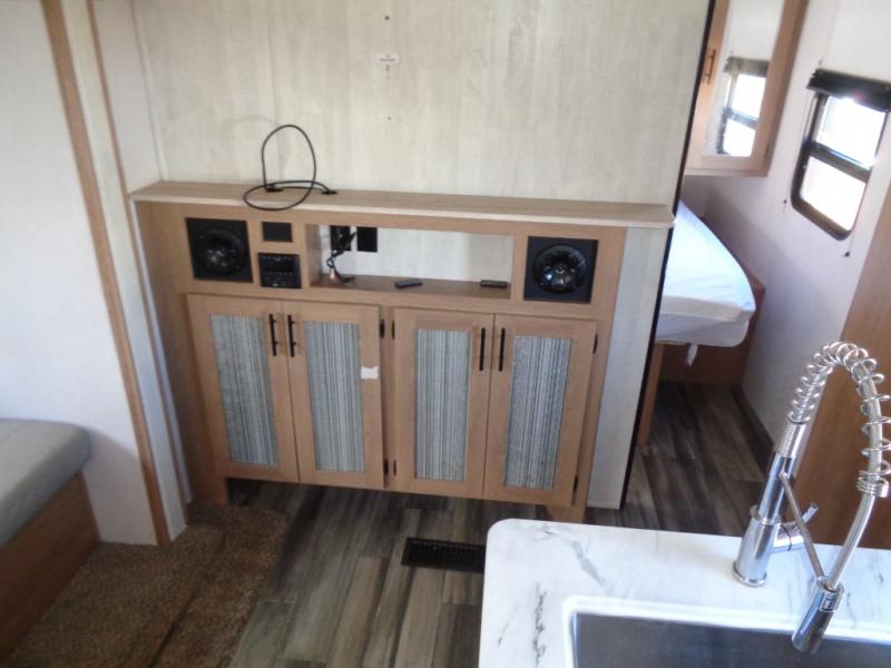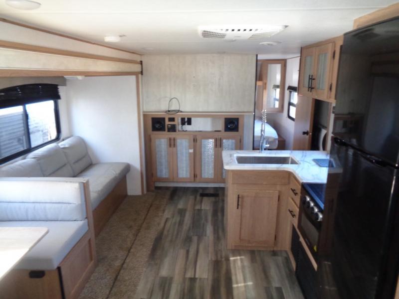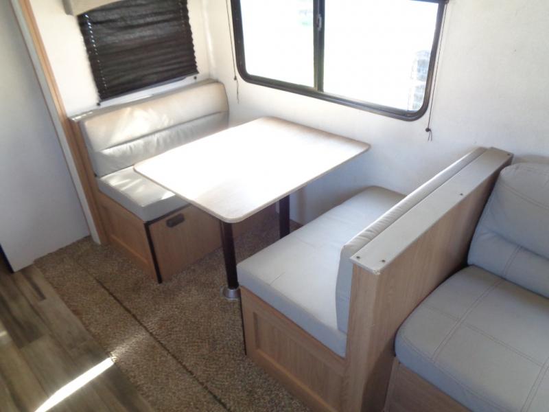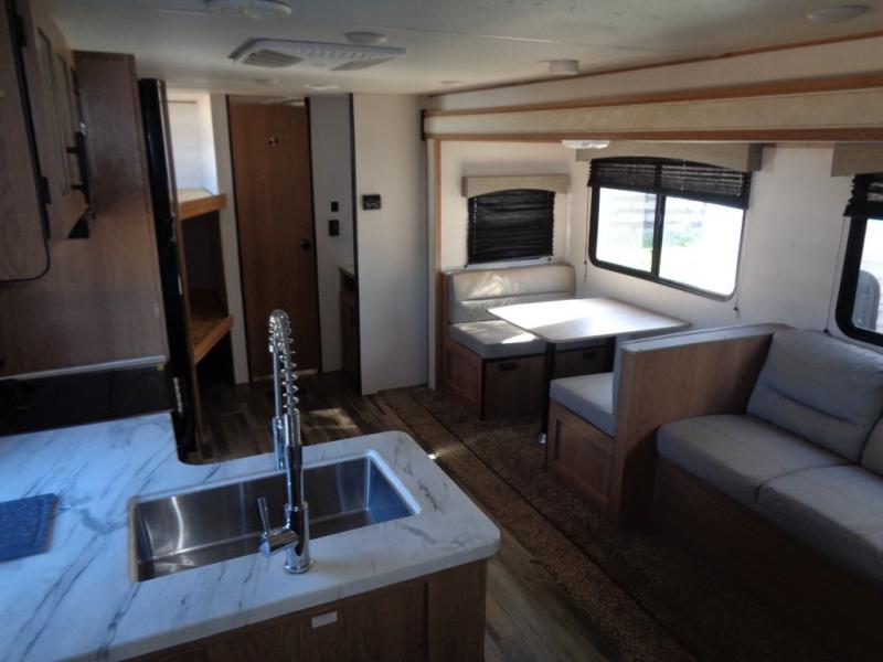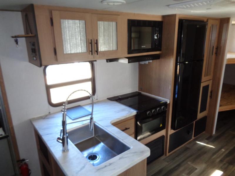 Looking for a trailer that houses everyone, this trailer offers lots of sleeping choices with a set of double-size bunks, a queen bed and furniture that doubles as sleeping space! You will also appreciate the added interior space thanks to the large slide in the living area that features a booth dinette and sofa. Up front, there is a private bedroom where you can retreat to at night away from the bunks in the back, and the bedroom features ample storage with dual wardrobes and an overhead shelf for your things.