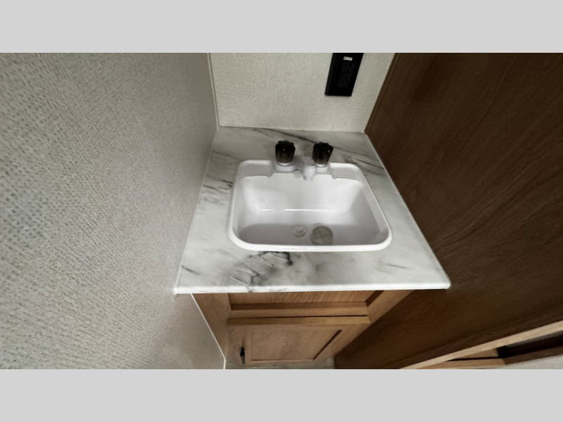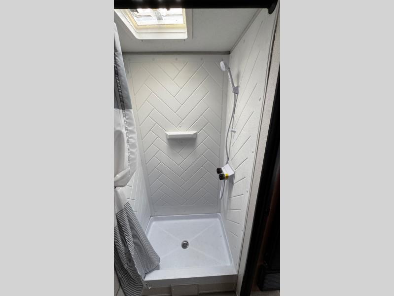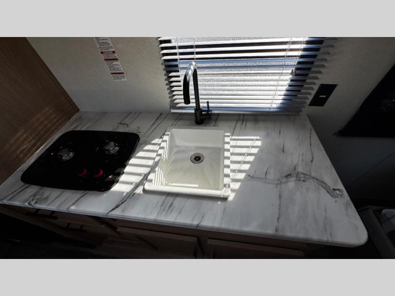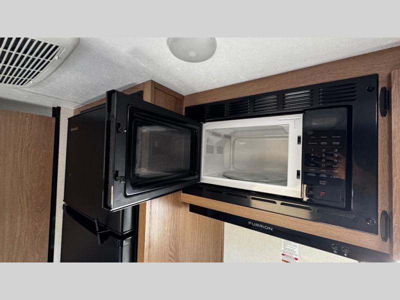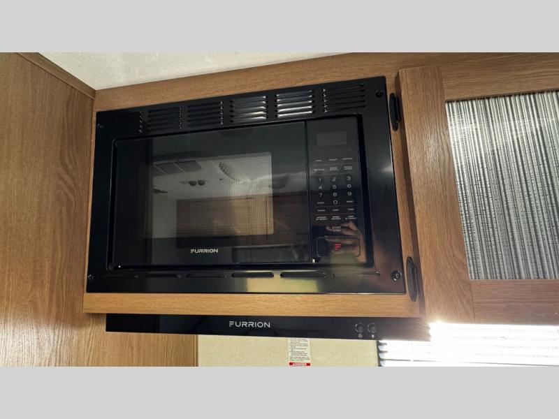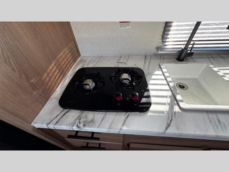 You'll love spending time outdoors with the LED-lit power awning and outside speakers as you sit under the awning or around the fire pit with your loved ones. When you get tired from your day of hiking, relax on the front bed with dual wardrobes and overhead cabinets to hold your clothing and such. And you'll appreciate the extra lighting from the kitchen skylight as you cook with the two-burner cooktop or microwave.