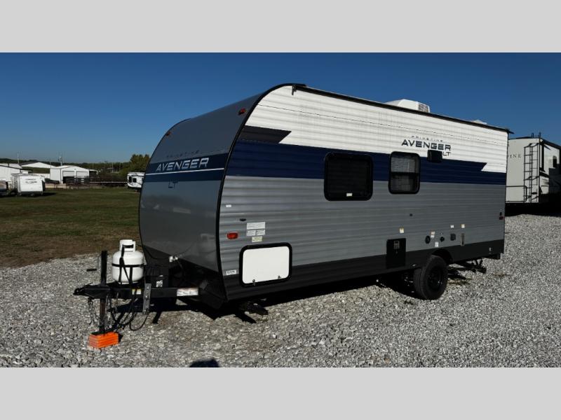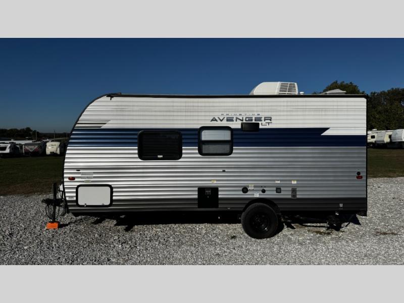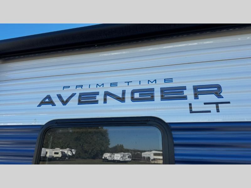 With any Avenger LT travel trailer by Prime Time, the exterior includes an aerodynamic front profile, a front diamond plate for protection on the road, and two rear stabilizer jacks. The interior offers seamless Carefree Congoleum flooring for easy cleanup and durability, pleated night shades throughout for privacy, a bottle opener, and extended ball bearing drawer guides. Other features include a 16,000 BTU furnace, a gas DSI water heater, and each has been prepped for a back up camera and solar.