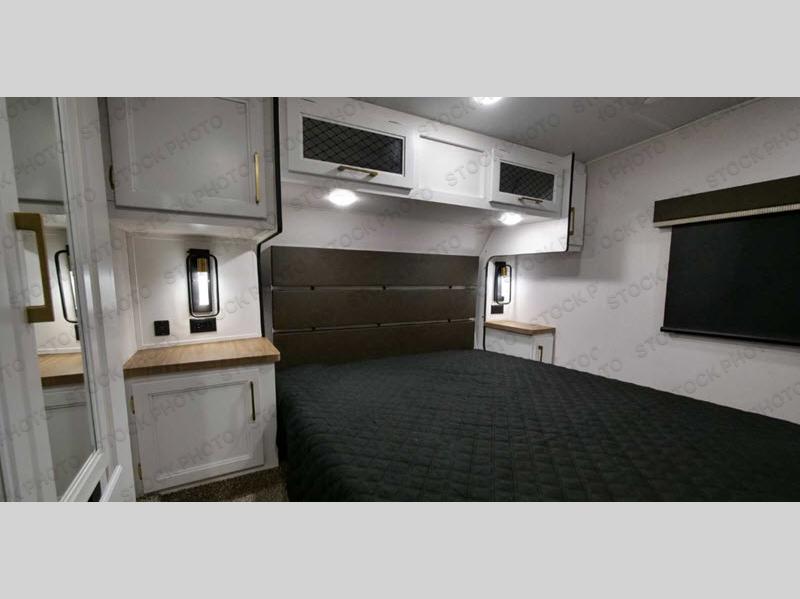 Get ready to see and do it all with this spacious fifth wheel in tow! The rear living area will be a favorite place to visit with friends on the hide-a-bed sofa and theater seating, plus there is a large LED TV within the entertainment center to keep you busy. A kitchen island with a butcher block top will make prep time easier than ever, and check out the storage you'll find in this kitchen; a walk-in pantry, a hutch, plus overhead cabinets! The spacious full bath will allow you to stay clean throughout your adventures, and the front private bedroom will feel just like home with a queen bed. There is also a wardrobe slide here and dual nightstands for your belongings.