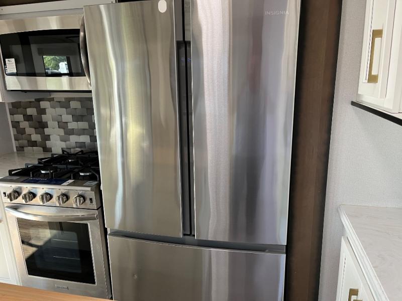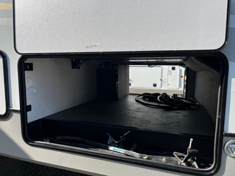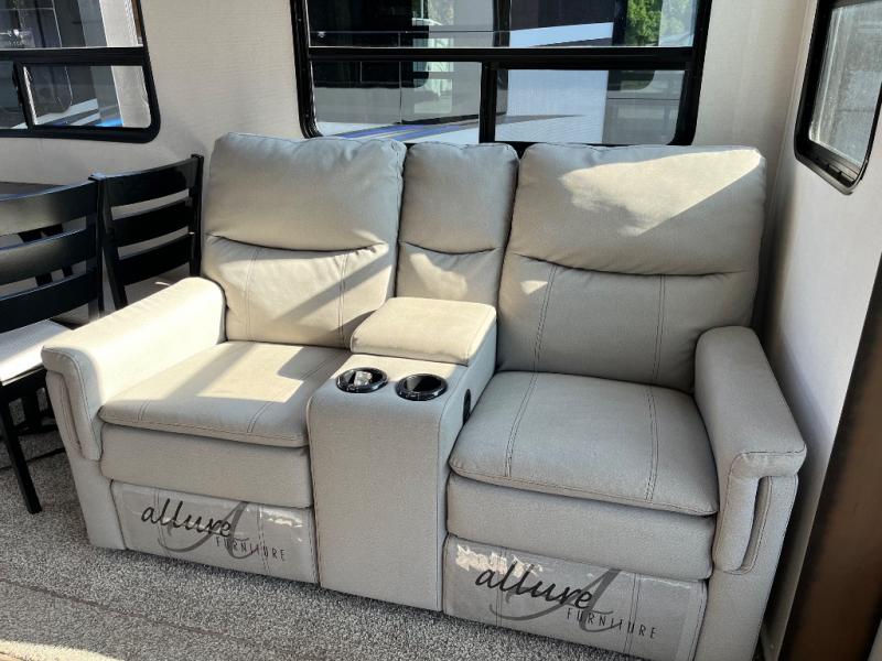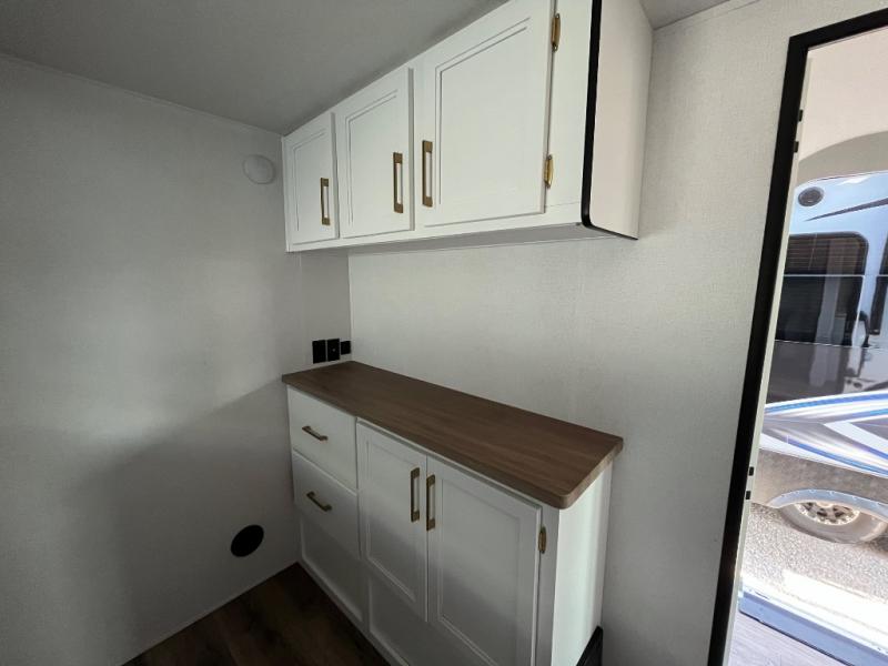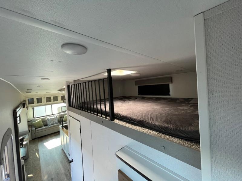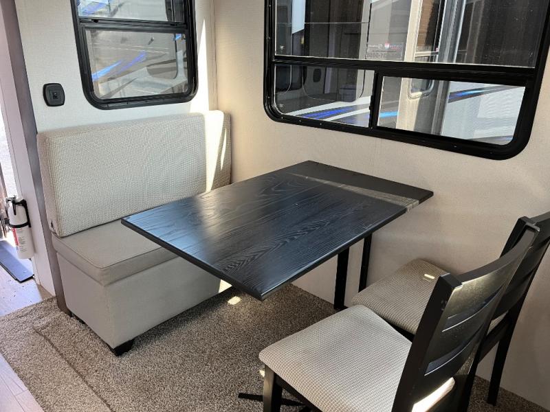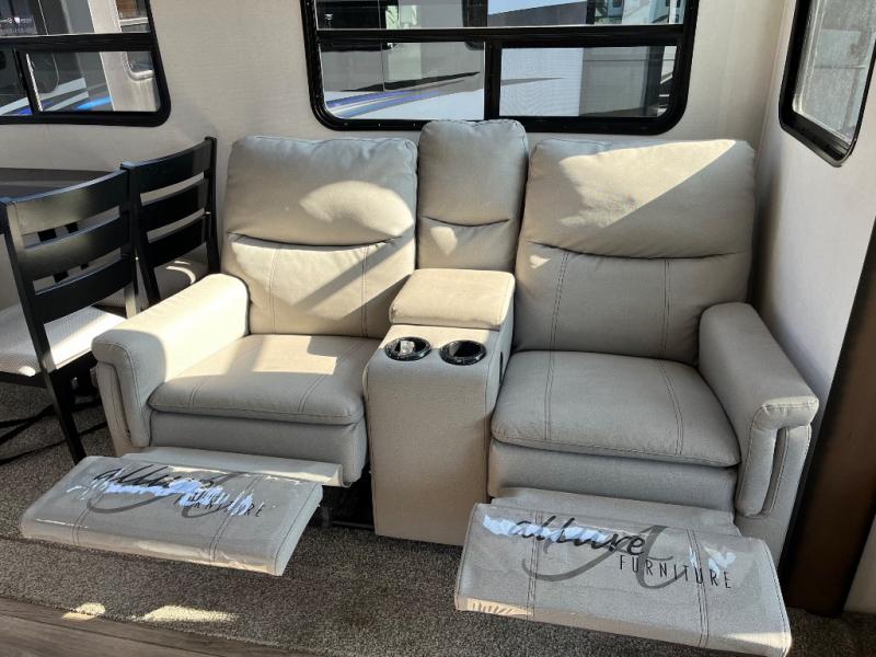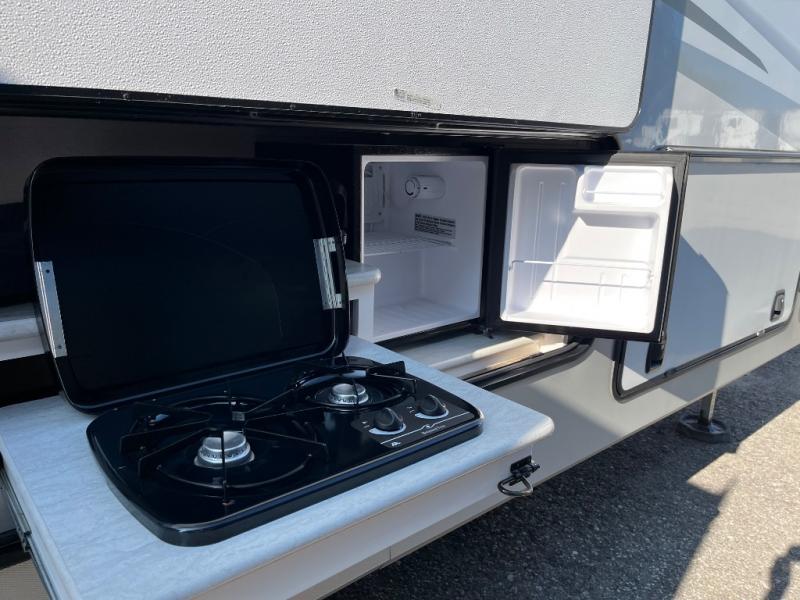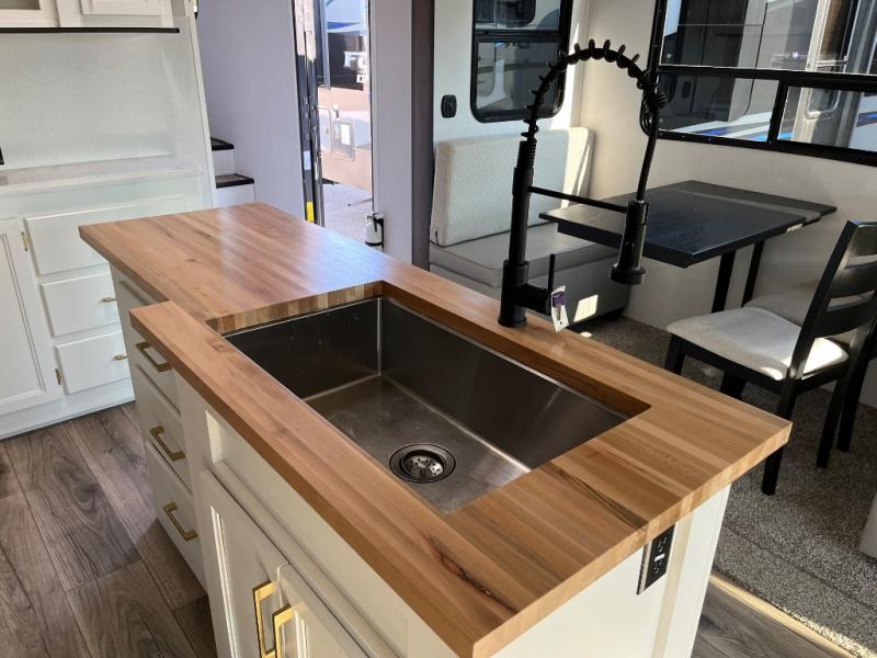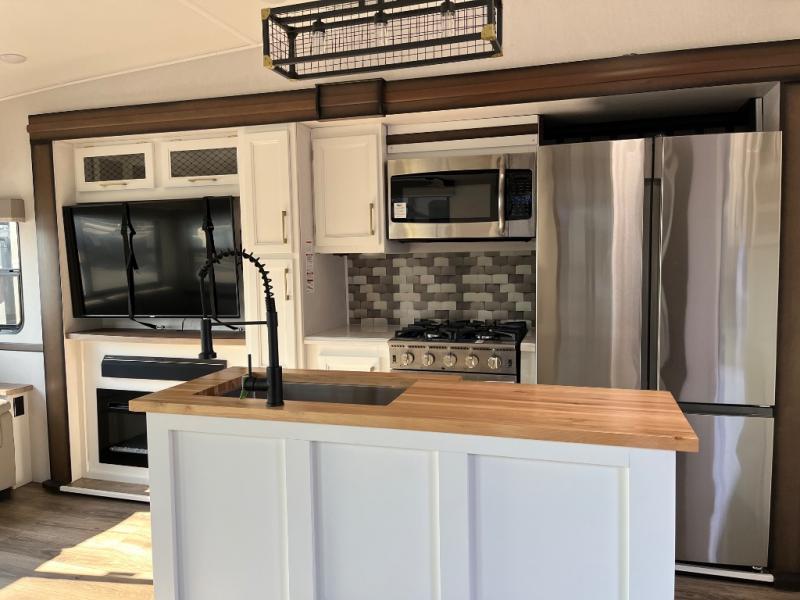 This fifth wheel is one your whole crew will love thanks to the middle bunkroom with a "Sleep & Play" sofa and an upper bunk! You will enjoy the front private bedroom all to yourselves with a king bed slide out, a large closet with washer and dryer prep, plus a dresser for more storage. When you're not outdoors relaxing under the 19' electric awning with LED lights, head to the rear living area to sit back on the theater seating or the hide-a-bed sofa. You'll also find an LED TV here and a booth dinette for game night. The chef will love the outside kitchen just as much as the indoor kitchen with a butcher block top, two pantries, plus a 30" residential style microwave!