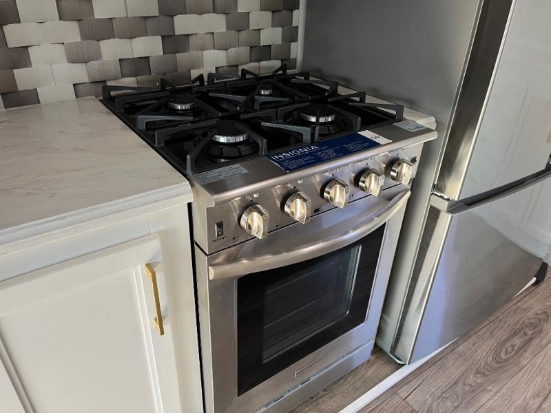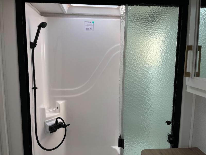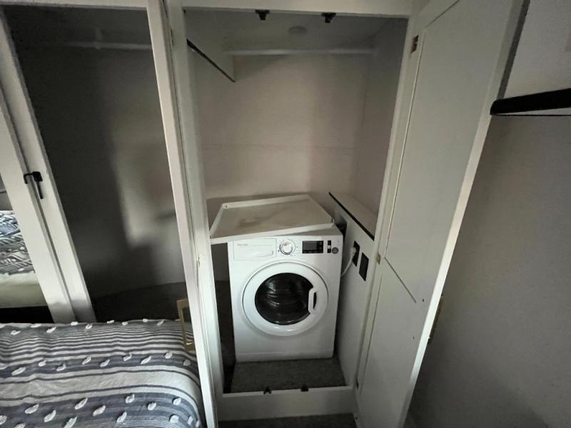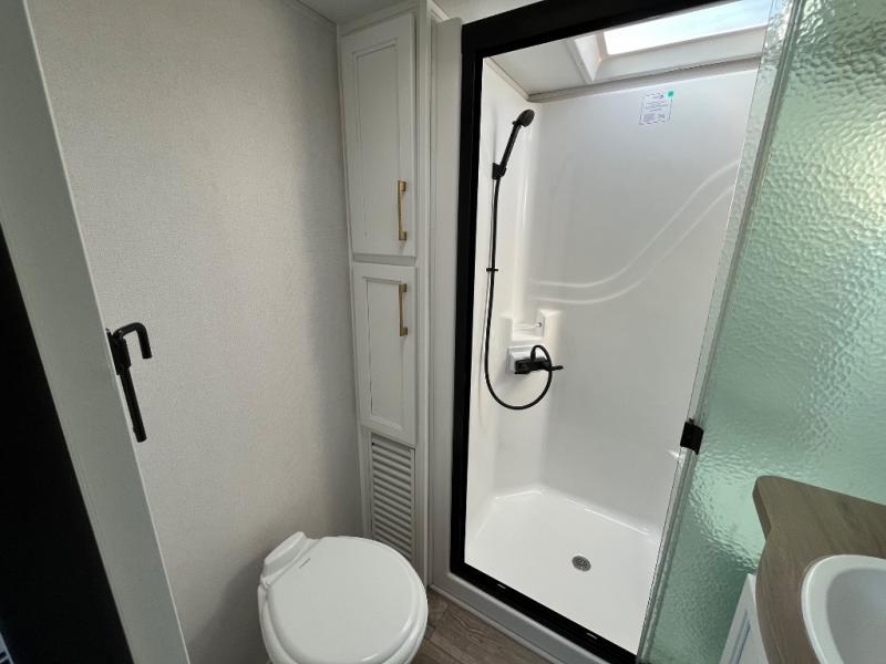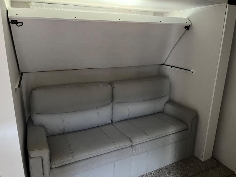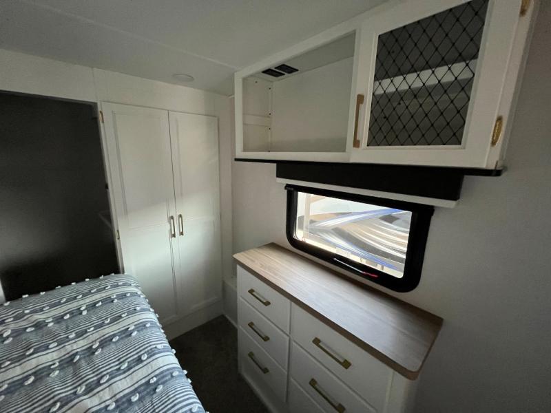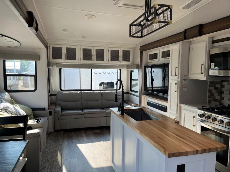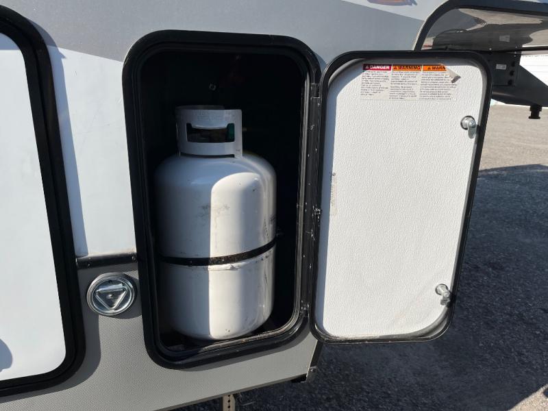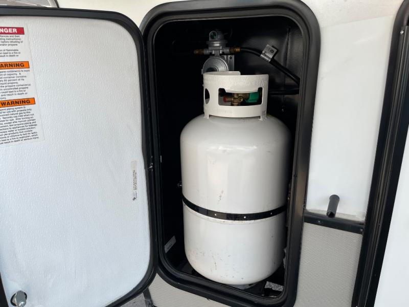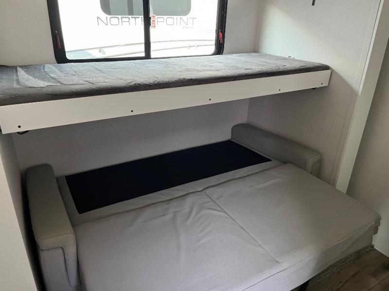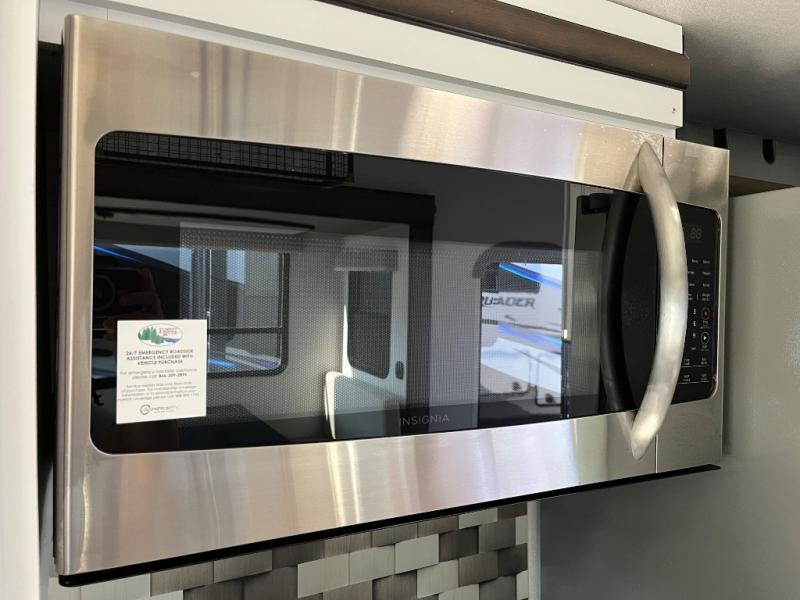 This fifth wheel is one your whole crew will love thanks to the middle bunkroom with a "Sleep & Play" sofa and an upper bunk! You will enjoy the front private bedroom all to yourselves with a king bed slide out, a large closet with washer and dryer prep, plus a dresser for more storage. When you're not outdoors relaxing under the 19' electric awning with LED lights, head to the rear living area to sit back on the theater seating or the hide-a-bed sofa. You'll also find an LED TV here and a booth dinette for game night. The chef will love the outside kitchen just as much as the indoor kitchen with a butcher block top, two pantries, plus a 30" residential style microwave!