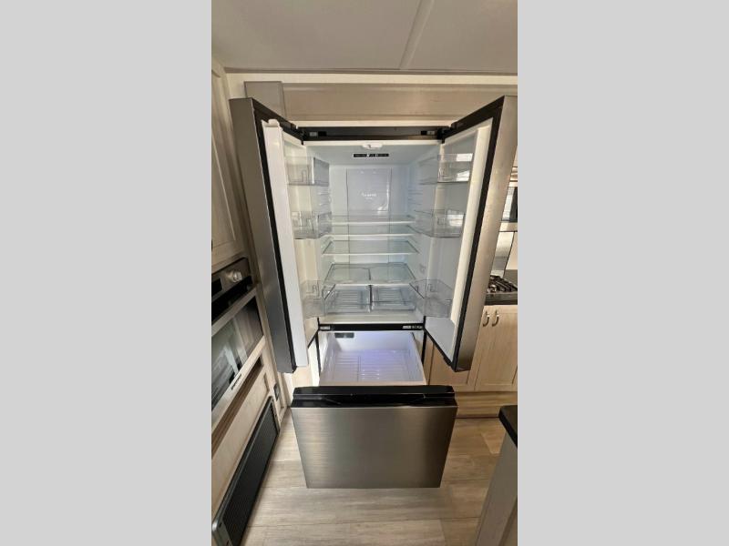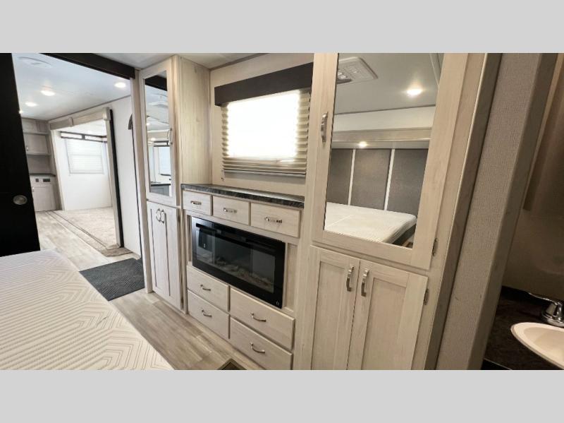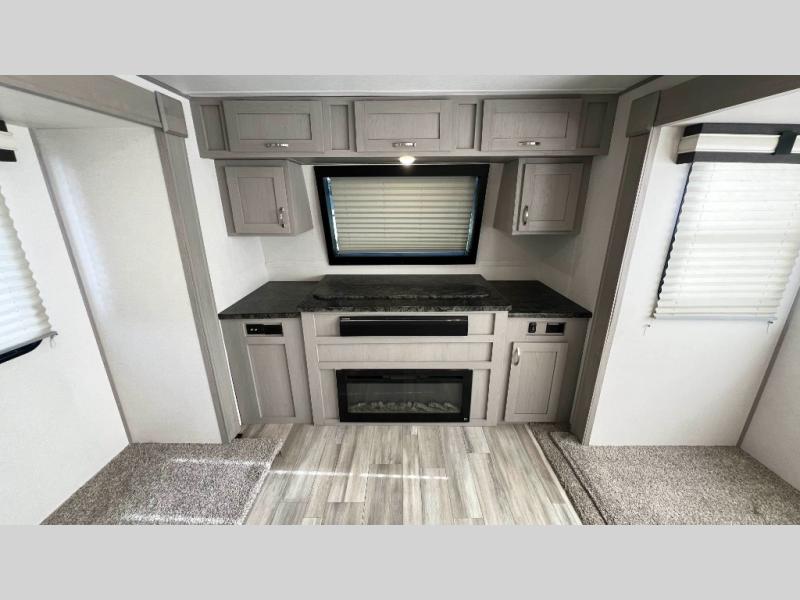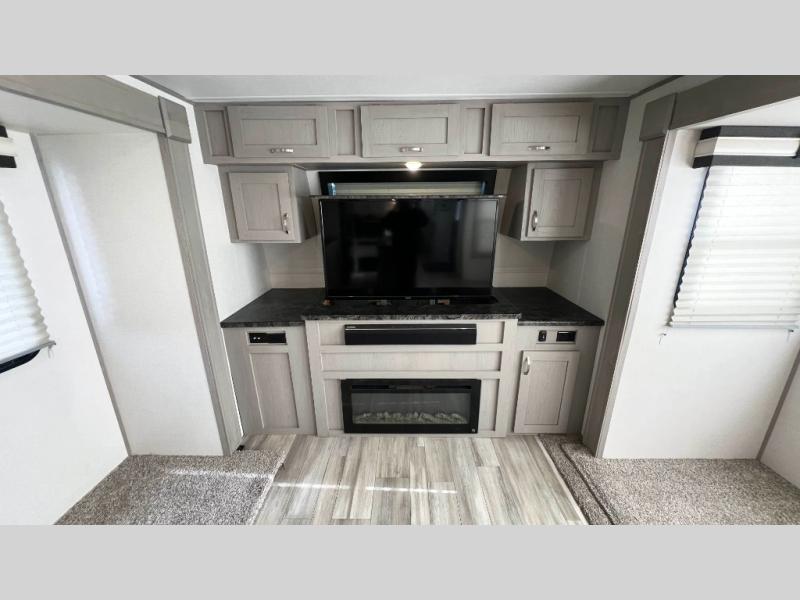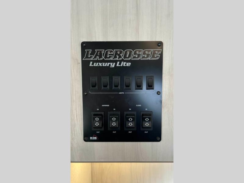 Make lasting memories in this LaCrosse travel trailer! Every adventure is taken up a notch with the quality features found on this trailer, like the front entertainment center with 50" LED TV and fireplace which can be seen from the theater sofa and hide-a-bed sofa. Right next to the hide-a-bed sofa you'll also find a free-standing table with chairs, so you can easily use this piece of furniture to watch TV too, or you can save it for a dining location. Whether you're a novice or a master chef, you'll get great use out of the kitchen which has a 10.7-cubic foot stainless steel refrigerator, an electric wall oven, a 30" microwave oven, and a Furrion residential cooktop. There is also a hutch that you can use for your dishes. At the end of a long day, step foot into your own dream oasis in the back of this trailer. This master suite has a king bed slide across from a fireplace and a dual-sink vanity in the full bathroom.