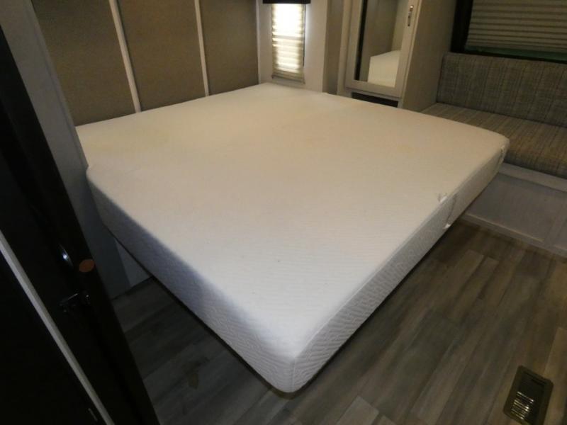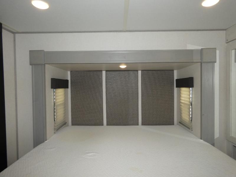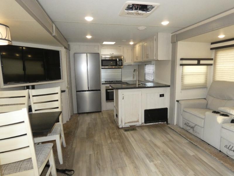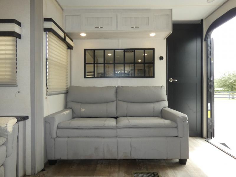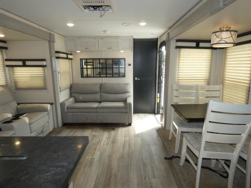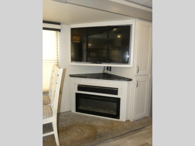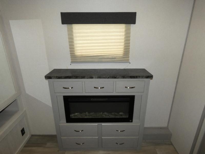 You will be ultra impressed by this LaCrosse travel trailer! First, the interior is made to feel just like your own home with its theater seating, hide-a-bed sofa, free-standing table with chairs, and entertainment center with 50" LED TV and fireplace. Second, you'll find even more residential comfort in the rear kitchen that has a Furrion residential cooktop, a 30" microwave oven, and a 10.7-cubic foot refrigerator. And lastly, the walk-through bathroom has two doors on either side with one of those doors leading directly into the front private bedroom, so you know you'll enjoy great comfort in this space each night. There is also a bedroom bench at the front of this trailer which gives you an enjoyable place to relax as you take in the views from the front windshield.