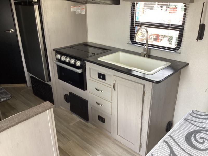 If you are searching for bunk beds, this trailer offers the double-size version! And you will love the easy towing and gasoline savings when heading to your campsite. There is a full-size dinette that doubles as sleeping space and offers storage, kitchen appliances and a pantry, plus a full bathroom with a full-size shower. And the front queen bed allows you access on either side and includes dual wardrobes. So load up and enjoy!