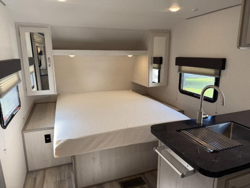This is a perfect couple's trailer with the front walk-around queen bed including nightstands and wardrobe cabinets on each side, plus additional shelving above, and the main area slide out provides more interior space to move about. The U-shaped dinette offers a place to dine, play games and relax as well as sleep allowing you to offer overnight guests sleeping arrangements, plus the large two-door refrigerator makes it easy to grab a drink before sitting down. The kitchen also offers a stovetop and oven, a range hood, a microwave, and an L-shaped counter with a farm-style sink. And the corner full bathroom provides a space-savings radius shower.