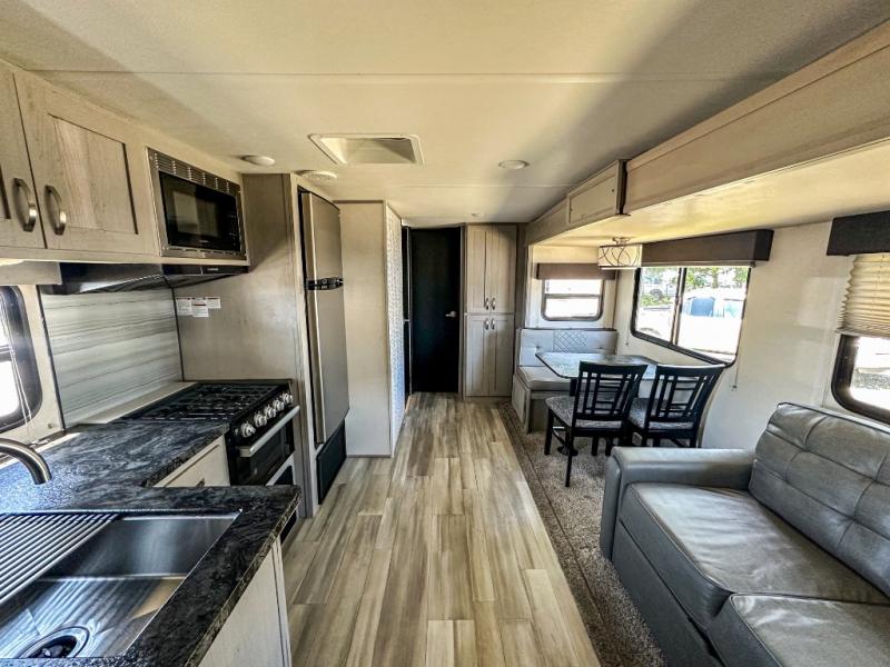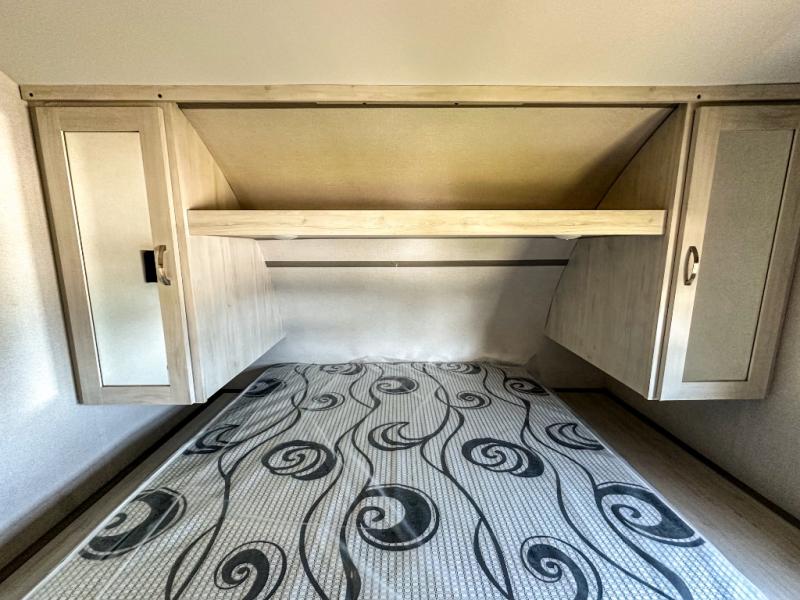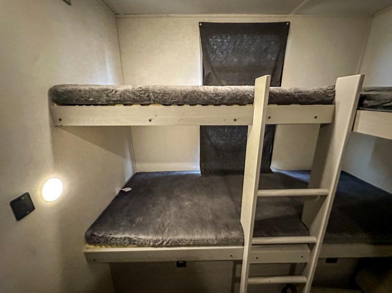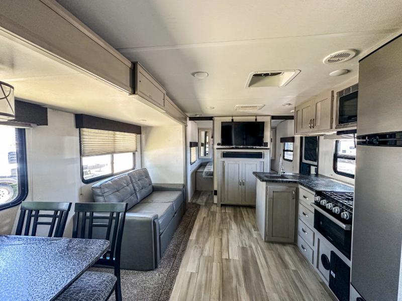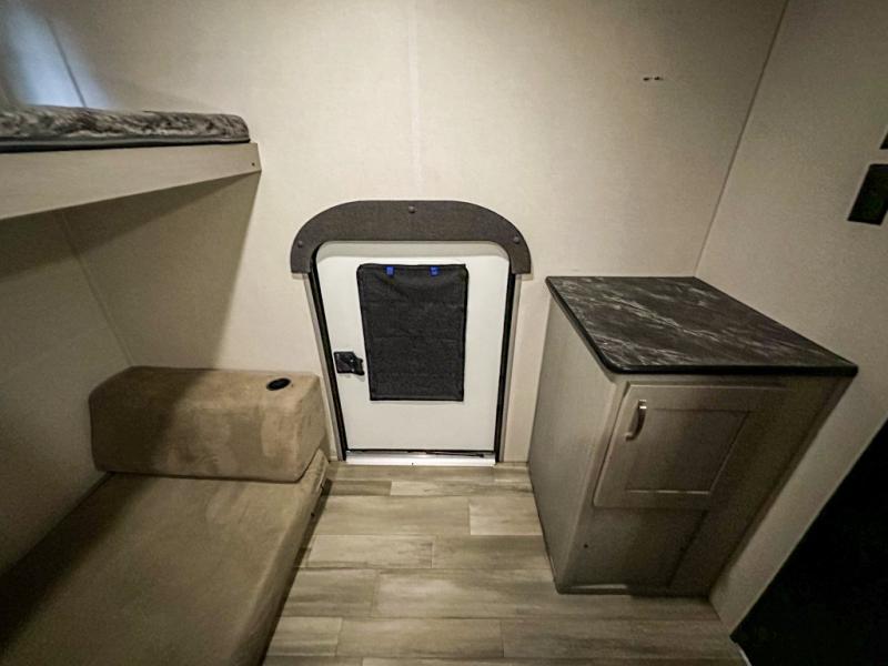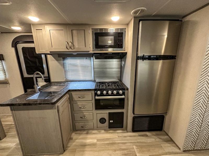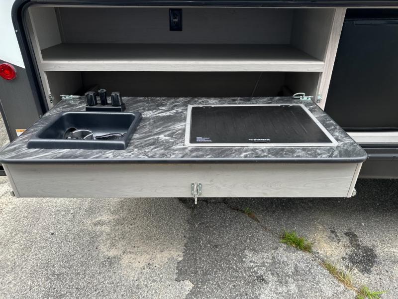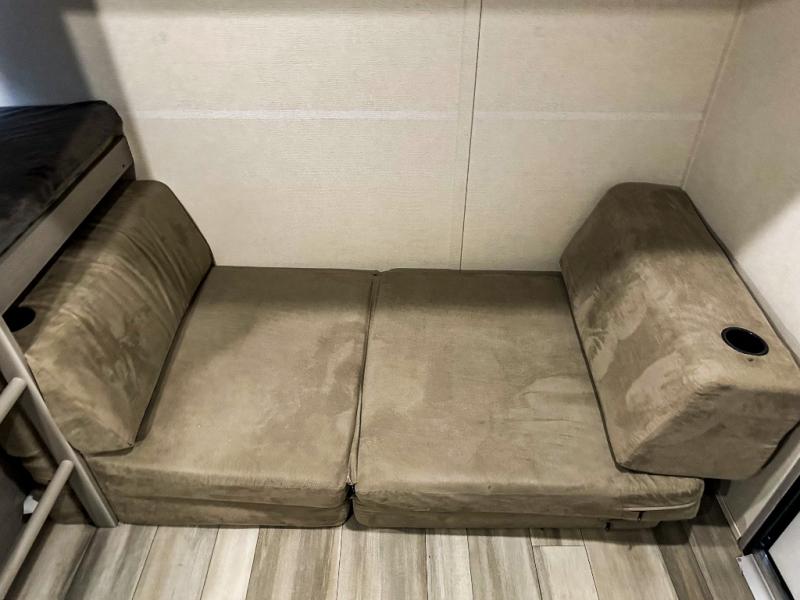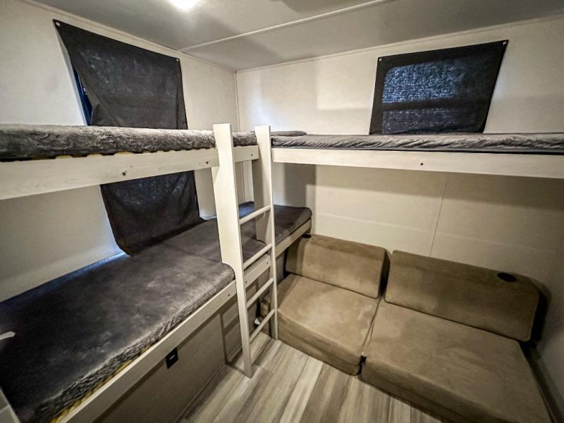 Get ready for inside fun and outside adventure when you have this trailer setup at your favorite campgrounds! From the private bunkhouse with three bunks and two cushion cubes that fold out into a queen bed and a wardrobe to the outside kitchen for more choices when feeding the crew, you will love camping every chance you get. The 19' power awning offers an outdoor living area protected from the elements, just add your camping chairs. The inside is spacious with a large slide out that includes a booth dinette and hide-a-bed sofa where you can watch the entertainment center and LED TV, and the cook will love the full kitchen amenities including the two-way refrigerator, the farm-style sink and the floor-to-ceiling pantry for more snacks. And the front bedroom offers privacy to change, dual wardrobes and your own queen bed.