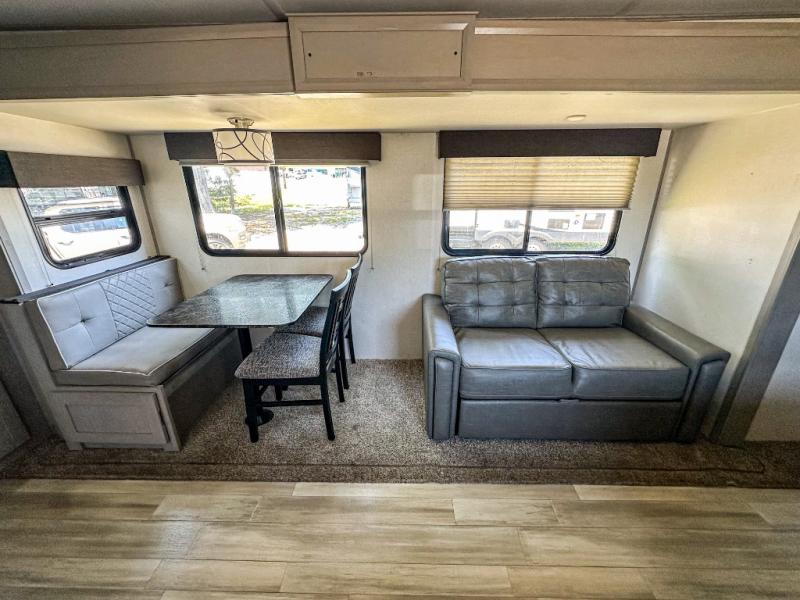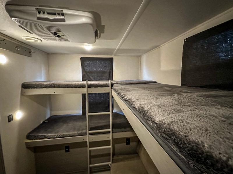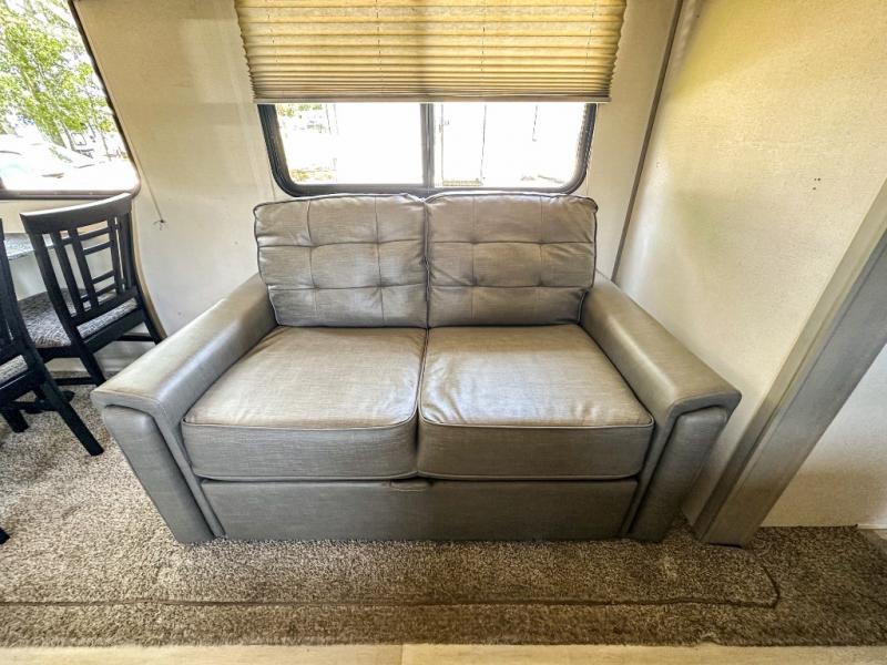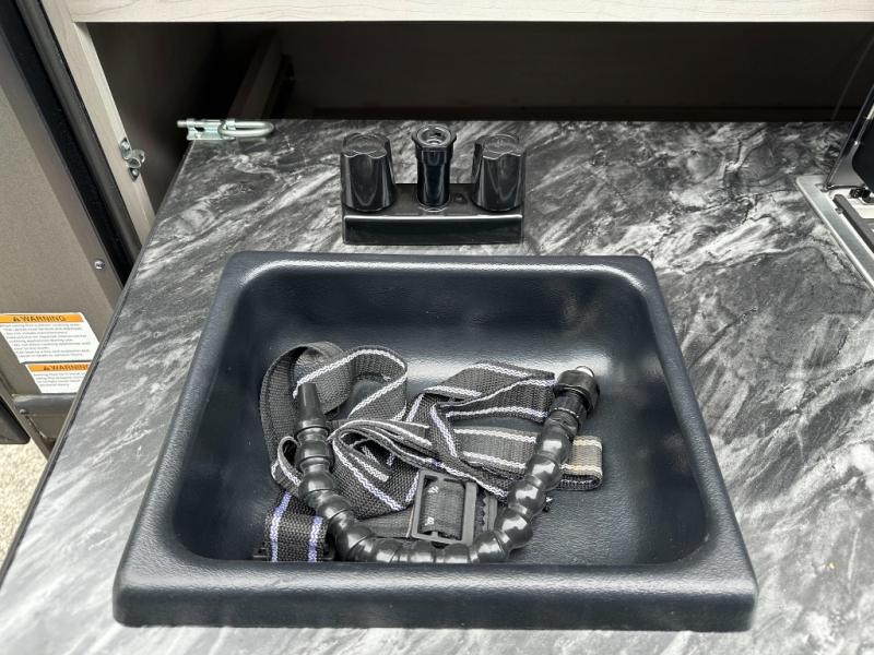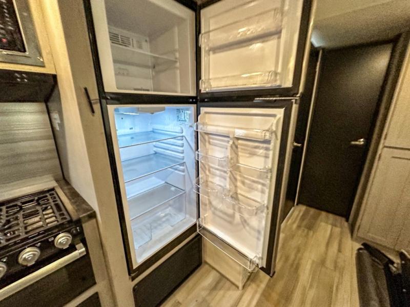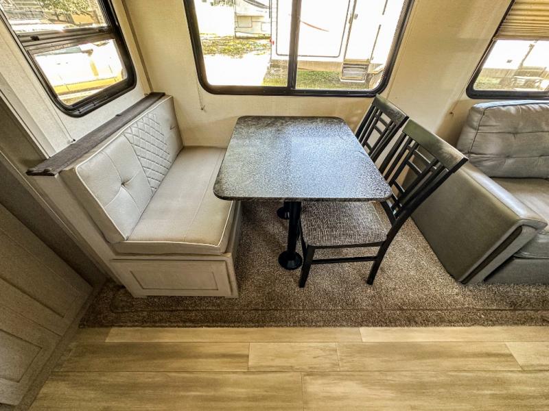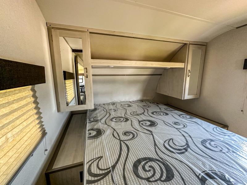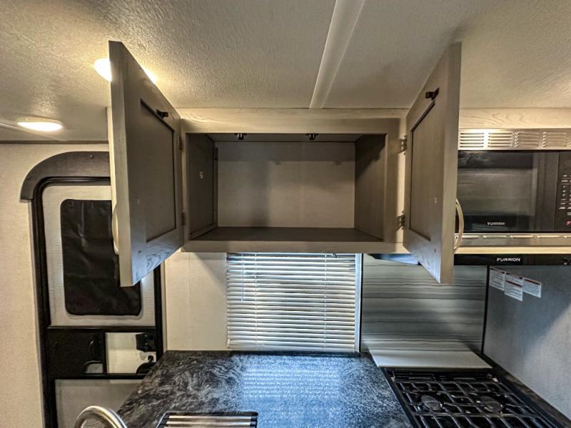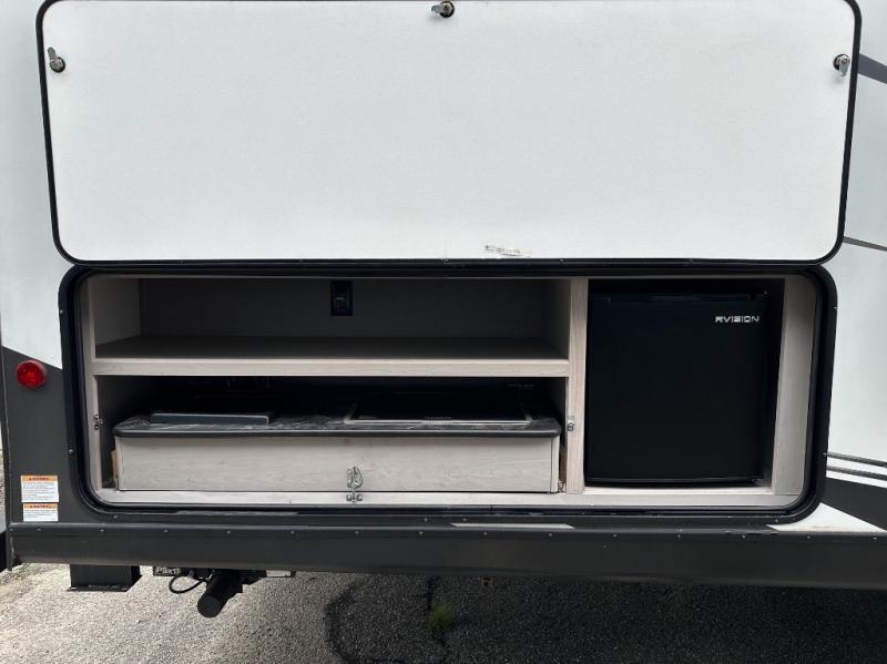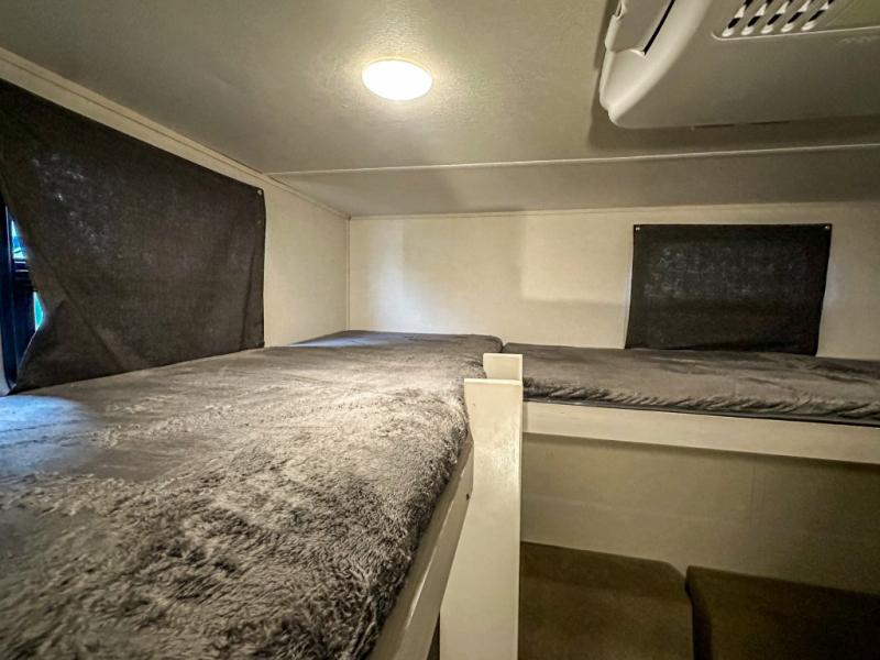 Get ready for inside fun and outside adventure when you have this trailer setup at your favorite campgrounds! From the private bunkhouse with three bunks and two cushion cubes that fold out into a queen bed and a wardrobe to the outside kitchen for more choices when feeding the crew, you will love camping every chance you get. The 19' power awning offers an outdoor living area protected from the elements, just add your camping chairs. The inside is spacious with a large slide out that includes a booth dinette and hide-a-bed sofa where you can watch the entertainment center and LED TV, and the cook will love the full kitchen amenities including the two-way refrigerator, the farm-style sink and the floor-to-ceiling pantry for more snacks. And the front bedroom offers privacy to change, dual wardrobes and your own queen bed.