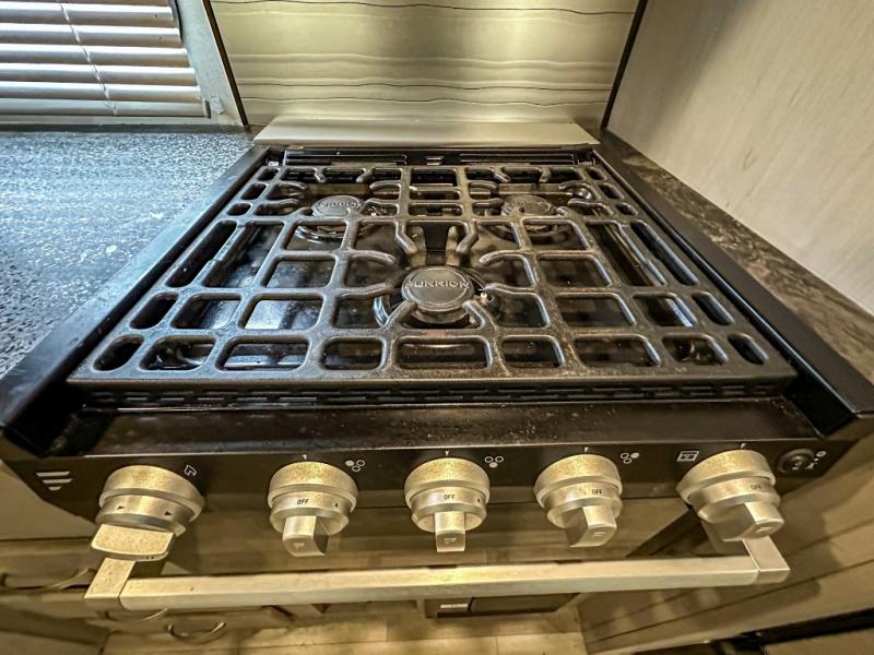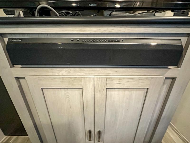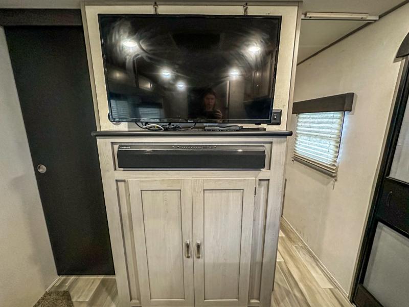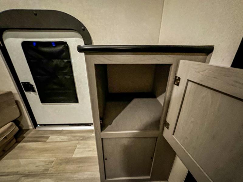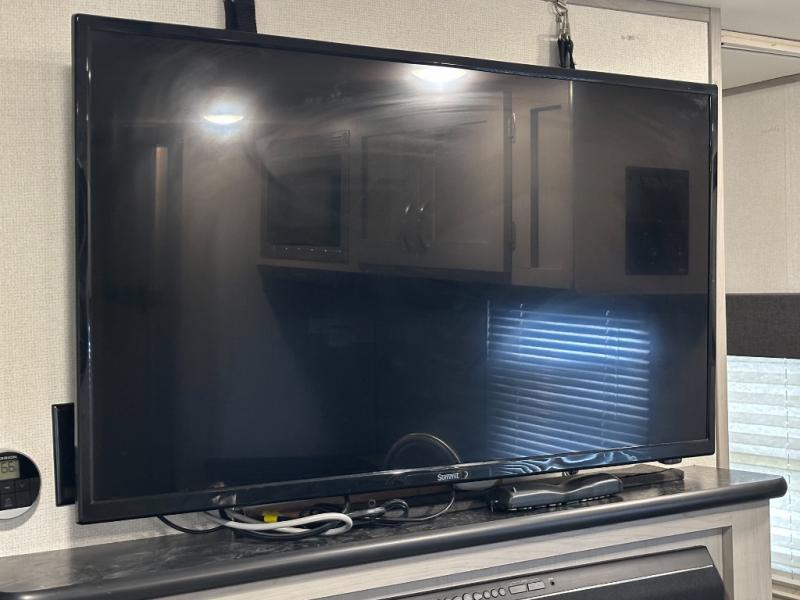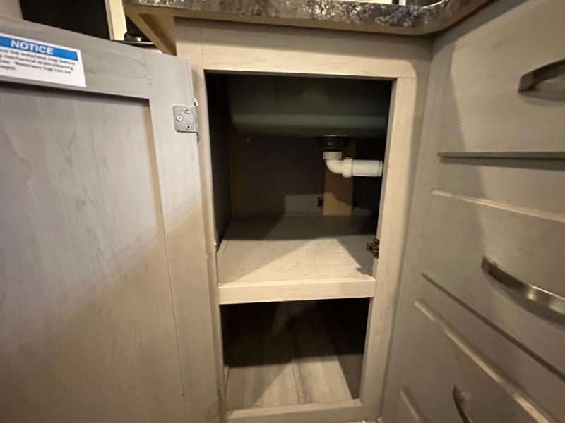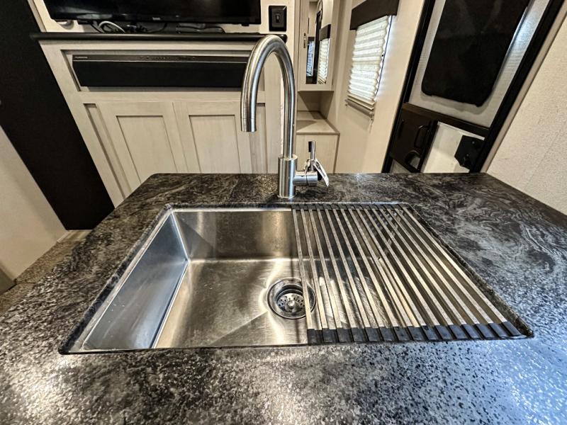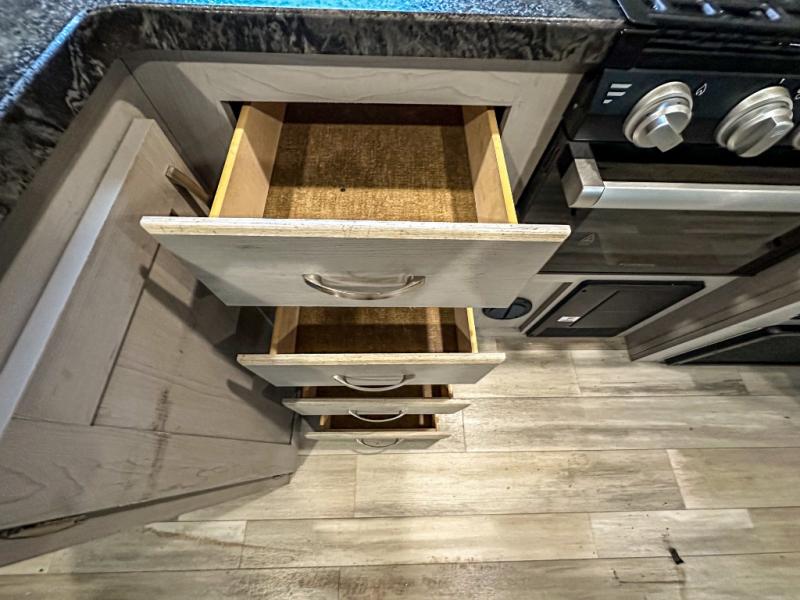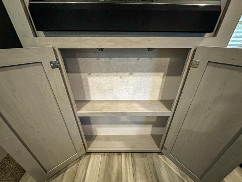 Get ready for inside fun and outside adventure when you have this trailer setup at your favorite campgrounds! From the private bunkhouse with three bunks and two cushion cubes that fold out into a queen bed and a wardrobe to the outside kitchen for more choices when feeding the crew, you will love camping every chance you get. The 19' power awning offers an outdoor living area protected from the elements, just add your camping chairs. The inside is spacious with a large slide out that includes a booth dinette and hide-a-bed sofa where you can watch the entertainment center and LED TV, and the cook will love the full kitchen amenities including the two-way refrigerator, the farm-style sink and the floor-to-ceiling pantry for more snacks. And the front bedroom offers privacy to change, dual wardrobes and your own queen bed.