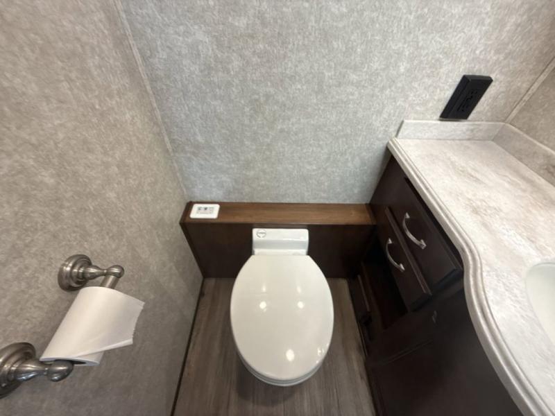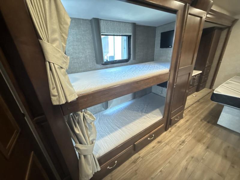 Hit the road to watch the leaves change in the fall, enjoy the sunshine during the summer and experience every season in its beauty! You can sleep like a king in this coach while your family or friends enjoy comfortable accommodations on the bunk beds or the furniture that doubles as extra sleeping space when needed. The rear bedroom also offers a 32" 4K Smart LED TV, closets and a space prepped to add the washer/dryer option. The bunk beds are across from the full bathroom which offers a radius shower with a skylight. The cook will enjoy making meals using the induction cooktop and the convection microwave oven, and the French door residential refrigerator will hold lots of food and beverages. The booth dinette and slide-a-bed sofa are a great place to visit and watch the 43" 4K Smart LED TV or head outside to sit under the electric awning with LED lights and watch the exterior 32" LED TV.