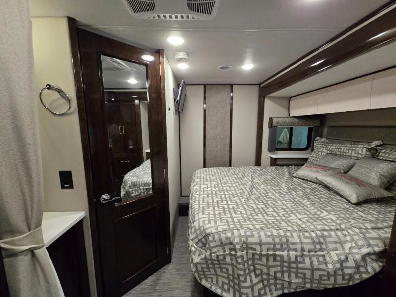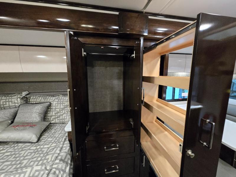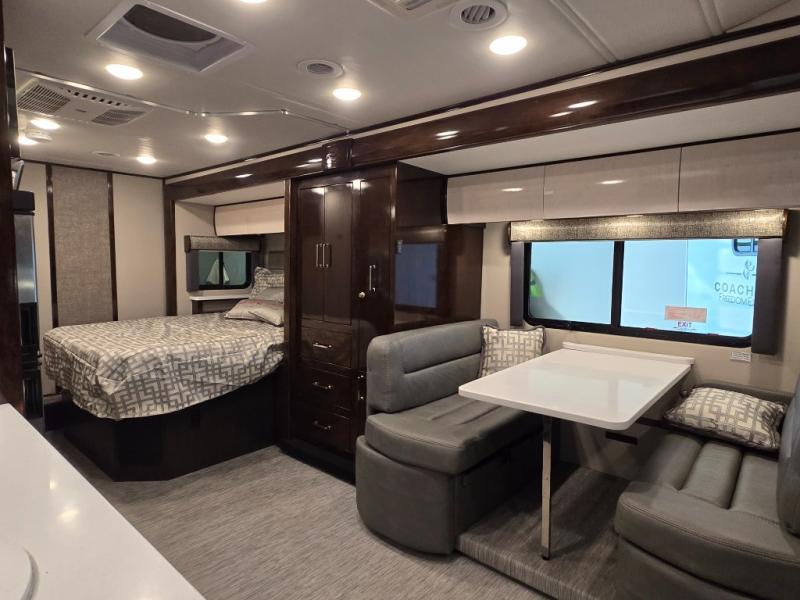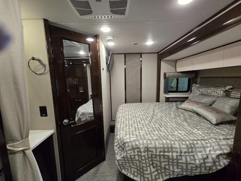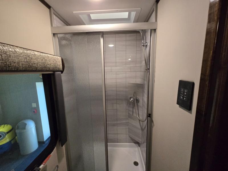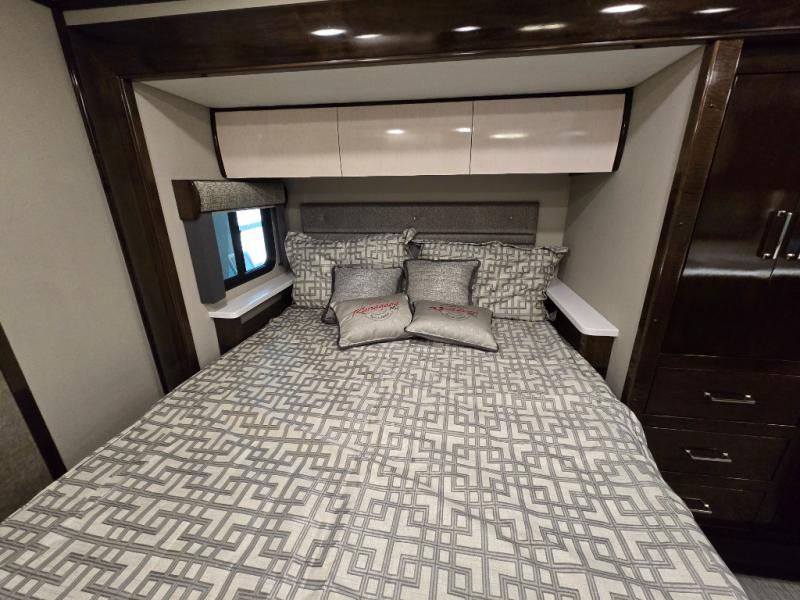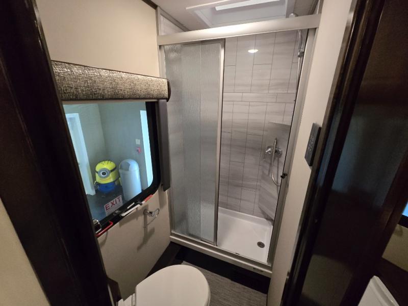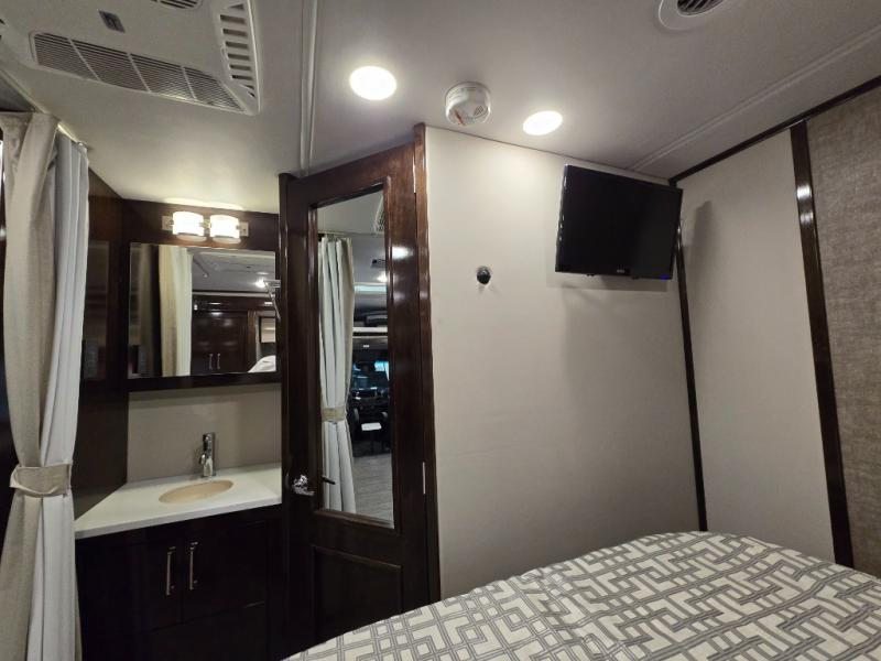 You will have a luxurious experience traveling in this motorhome! After a long day of traveling, you can either take a hot shower in the rear corner private shower and toilet room with the 24" x 36" shower or lay down on the RV queen bed within the large slide. The bathroom sink is just outside the door with a medicine cabinet to store your toiletries. There is plenty of storage throughout between the wardrobe, the overhead cabinets, and the pantry, as well as outside with side swing baggage doors. The dinette is a great place to enjoy meals, play games, and transform into a sleeping space, and with a 46" x 80" bunk mattress above the cab, another person can join in on the fun!