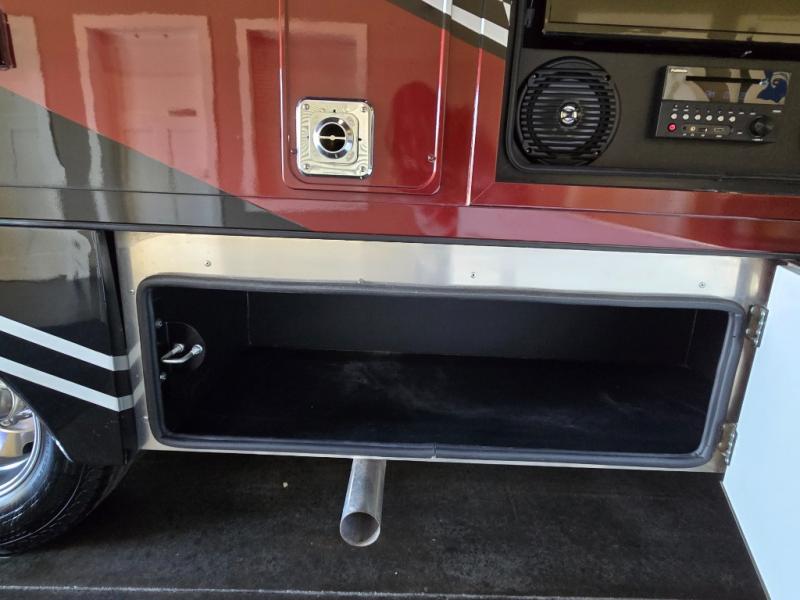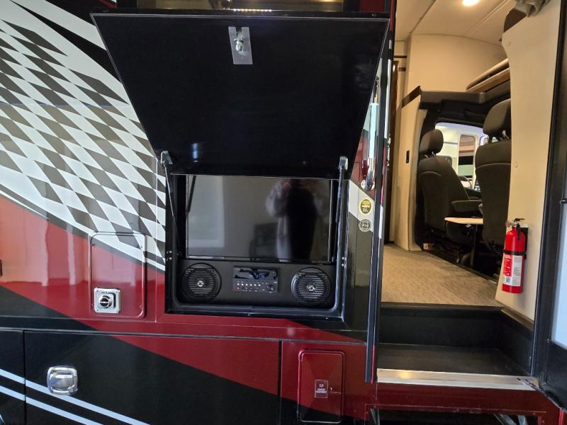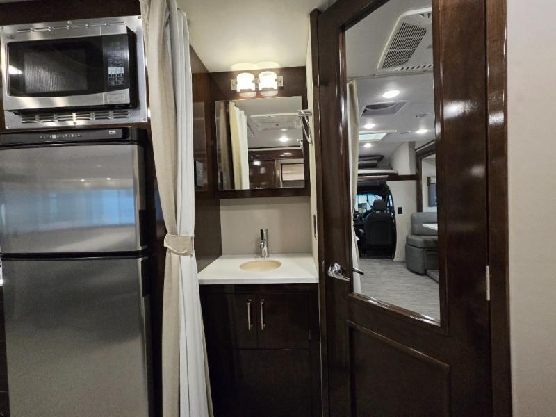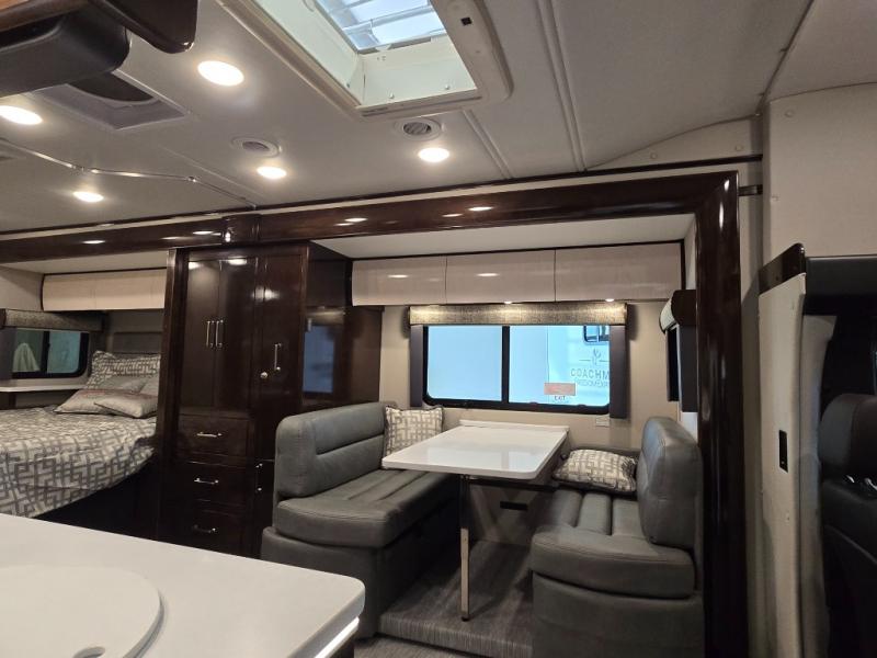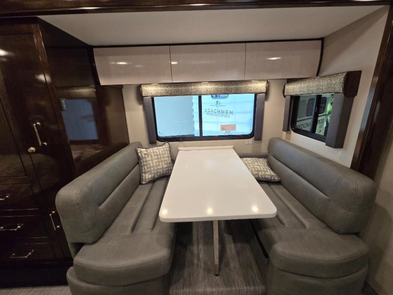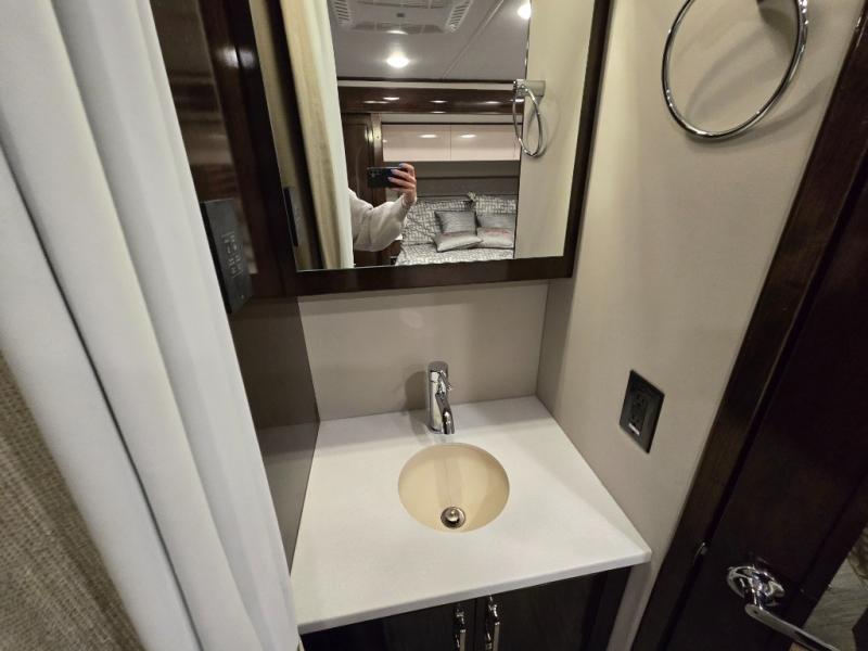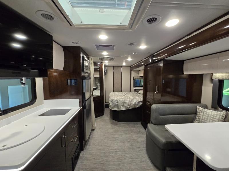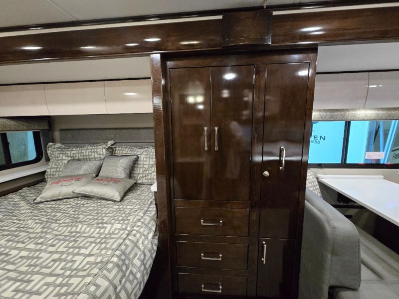 You will have a luxurious experience traveling in this motorhome! After a long day of traveling, you can either take a hot shower in the rear corner private shower and toilet room with the 24" x 36" shower or lay down on the RV queen bed within the large slide. The bathroom sink is just outside the door with a medicine cabinet to store your toiletries. There is plenty of storage throughout between the wardrobe, the overhead cabinets, and the pantry, as well as outside with side swing baggage doors. The dinette is a great place to enjoy meals, play games, and transform into a sleeping space, and with a 46" x 80" bunk mattress above the cab, another person can join in on the fun!