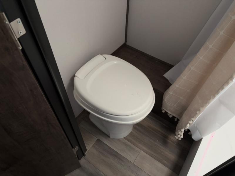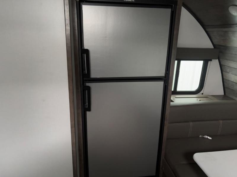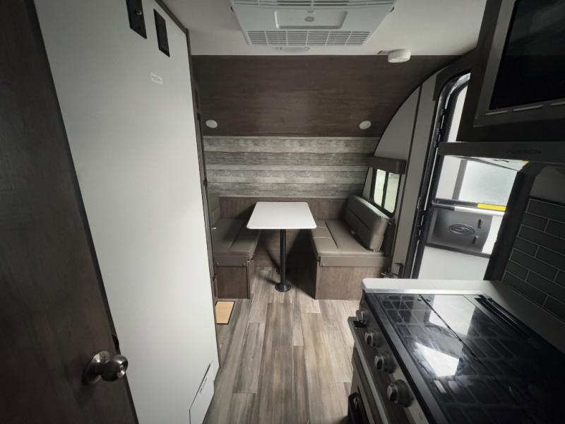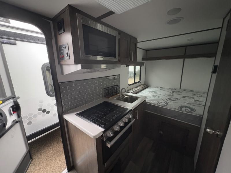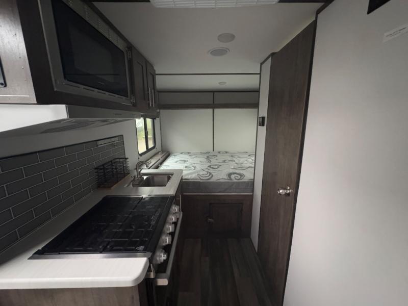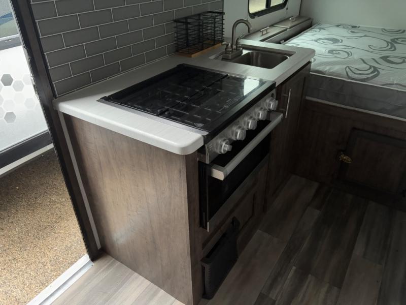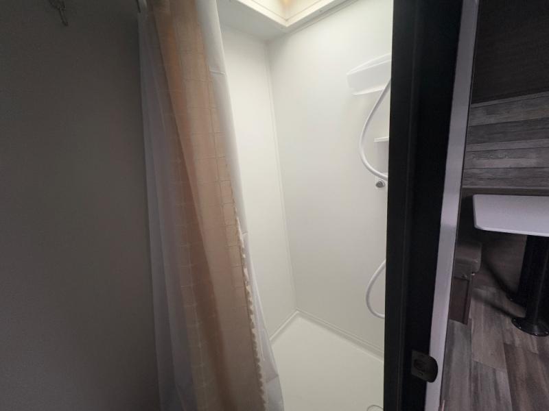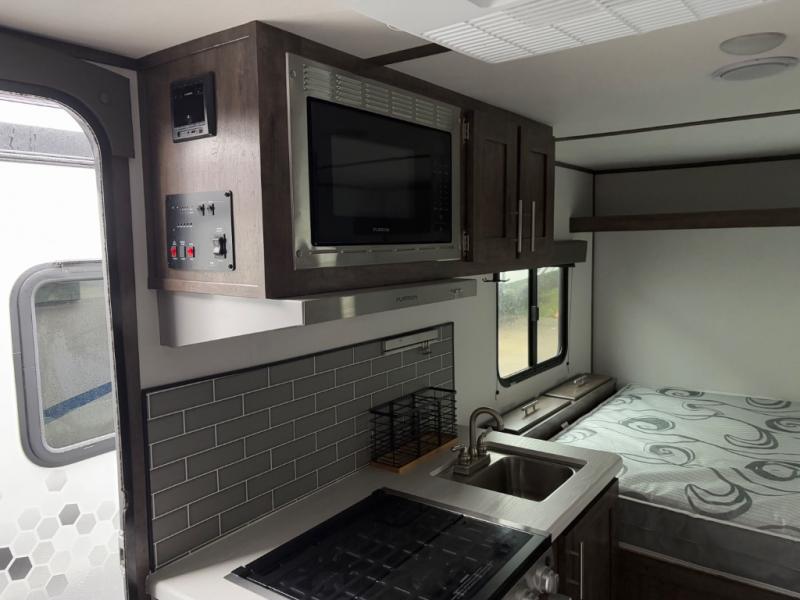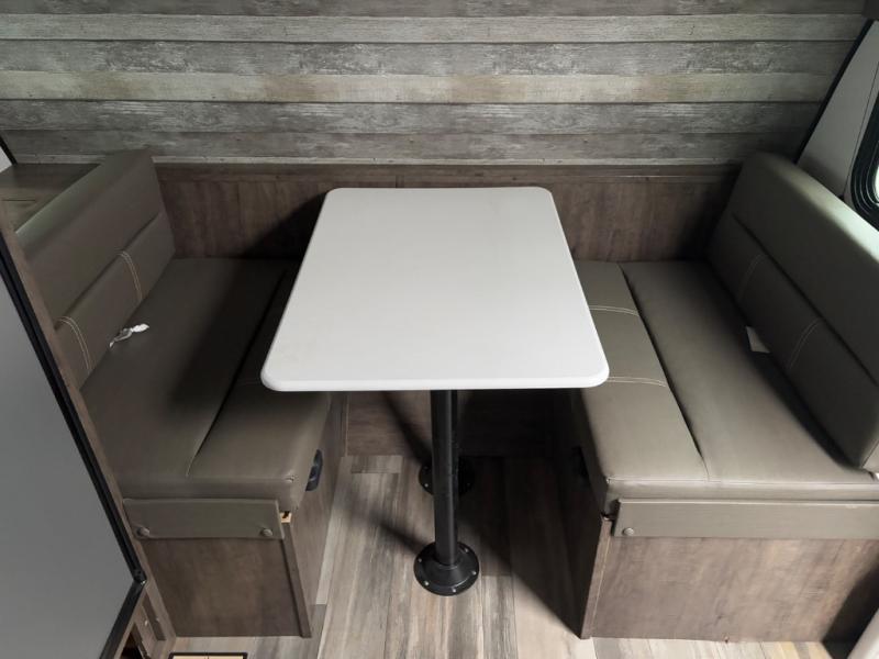 Comfort is found in this single axle travel trailer for three. You can prepare your own meals each day in the kitchen, and dine together at the booth dinette. If you'd rather have a sofa with a table, you can add that option in place of the dinette. There is a private toilet and shower for you to freshen up each day, and the rear 60" x 76" RV queen bed will make you feel right at home. No more sleeping on the floor!