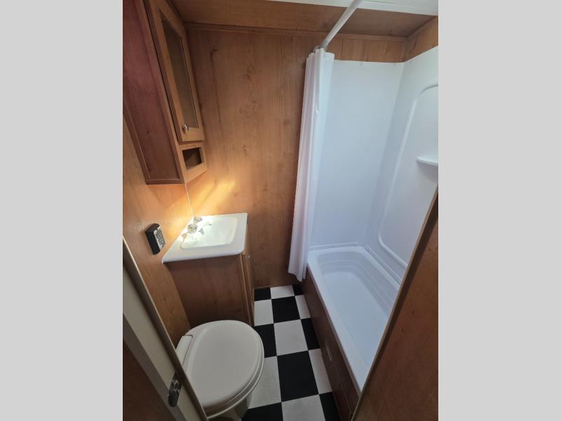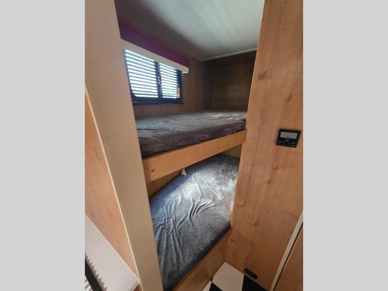 This is the perfect family-friendly travel trailer since it includes bunk beds for the little ones, and a front queen bed for you two. The full bath onboard will allow you to freshen up each day, and you can make meals using the fully-equipped kitchen. There is a booth dinette where you can dine together and sleep additional guests, and you'll find overhead cabinets for your belongings.