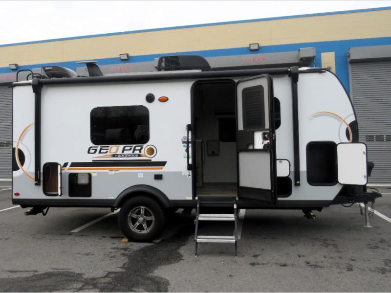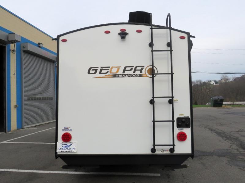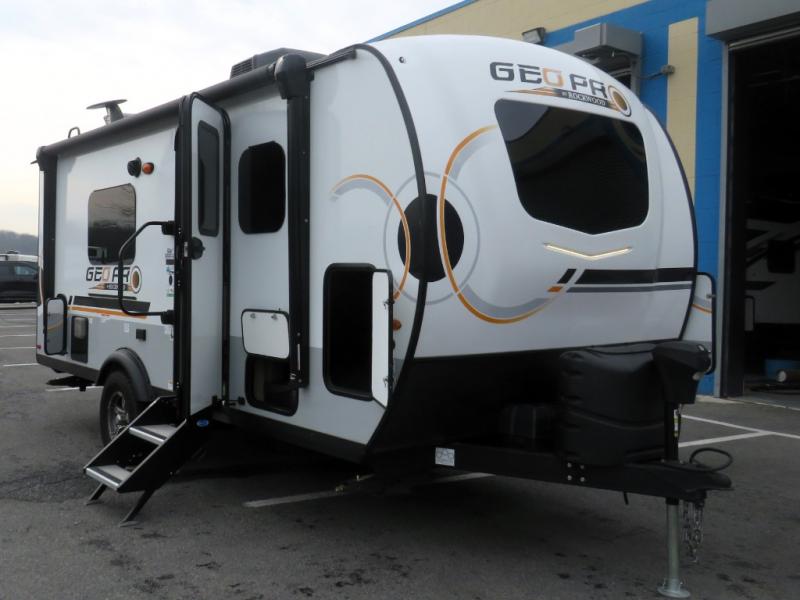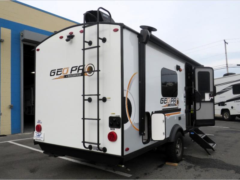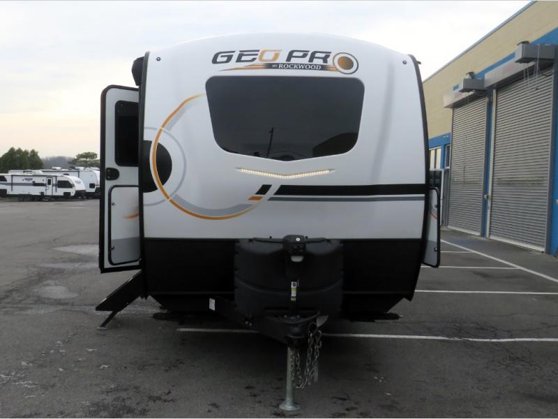 The Rockwood GEO Pro travel trailers and toy hauler by Forest River are ready for all your adventures. The interior and exterior Azdel construction, along with the vacuum laminated roof and walls provide a durable trailer, and the Dexter torsion axles with aluminum wheels make towing easier than ever. There are many convenient amenities, like the 13,500 BTU A/C, the Bluetooth system control panel, and the all-in-one Teton HD TV/WiFi/FM antenna with LTE prep. Each model includes frameless windows, fabric valances and roller shades, and a modern interior that will make you feel right at home. Everything you're looking for in your next RV is in a Rockwood GEO pro by Forest River!