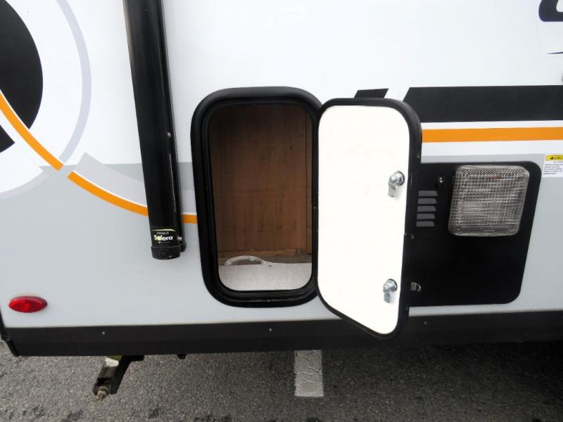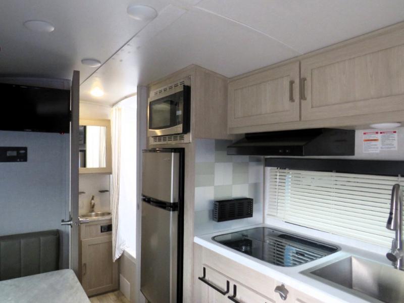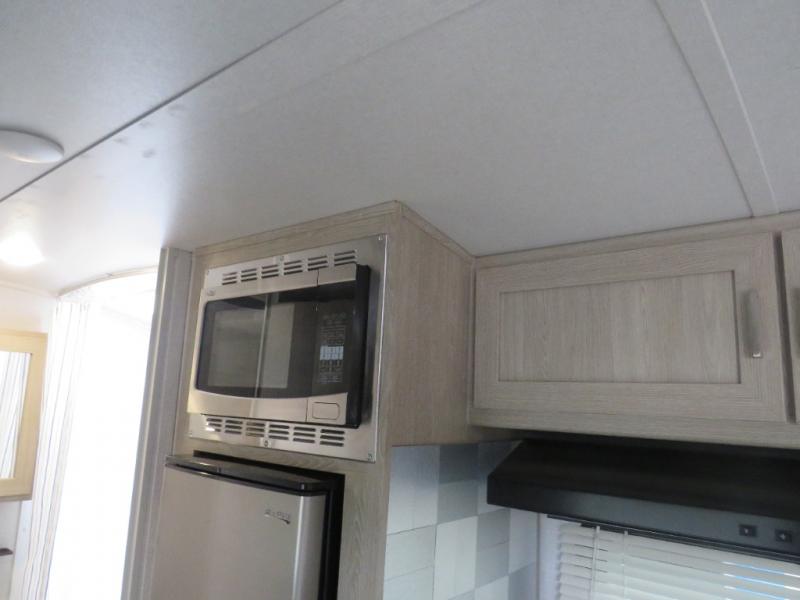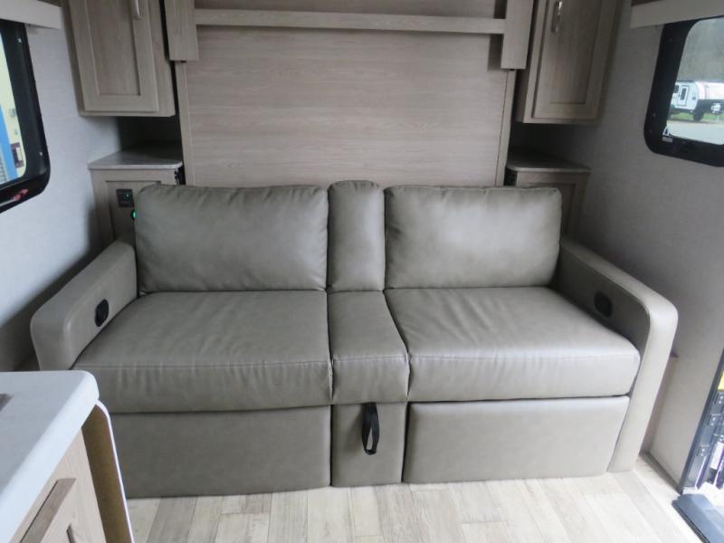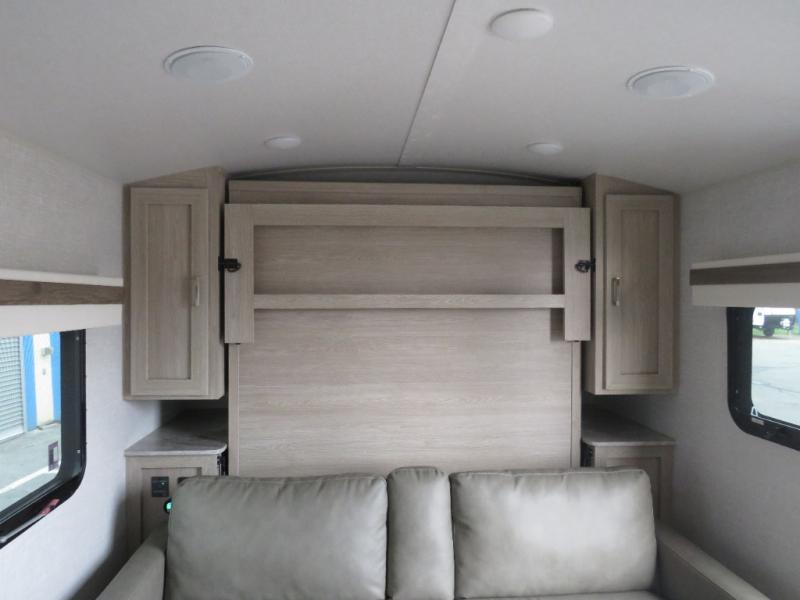 You will love how versatile this travel trailer is thanks to the Murphy bed up front. After you've had a great night's rest, just fold it up to relax on the 72" sofa. This will give the chef more space in the morning to prepare breakfast on the three burner cooktop. There is a 32" booth dinette to dine at, or you may just want to take your plate outdoors under the 13' power awning. The full rear bath includes a large linen closet to store clean towels and there is a Showermiser Water Saver you are sure to appreciate. This model also includes a pass-through storage, plus additional exterior storage so you can bring along hiking gear, water tubes, and fishing poles!