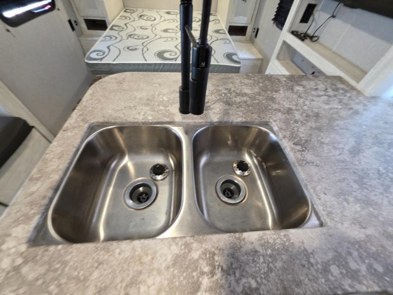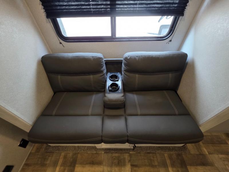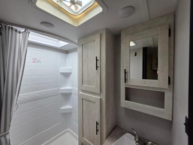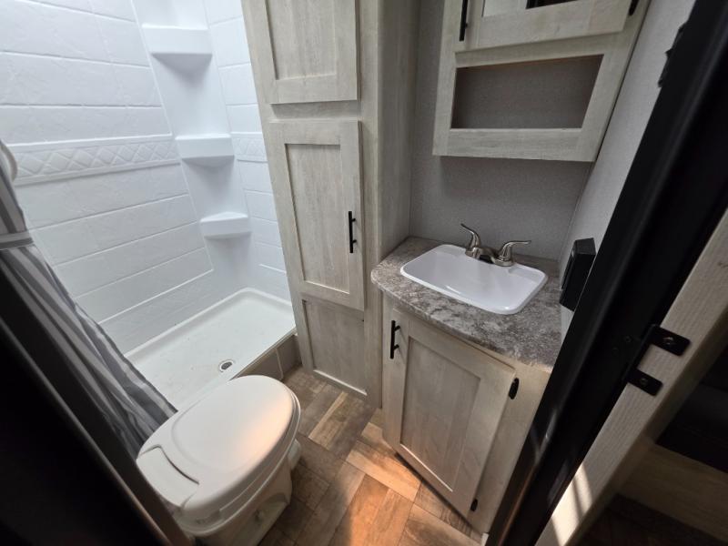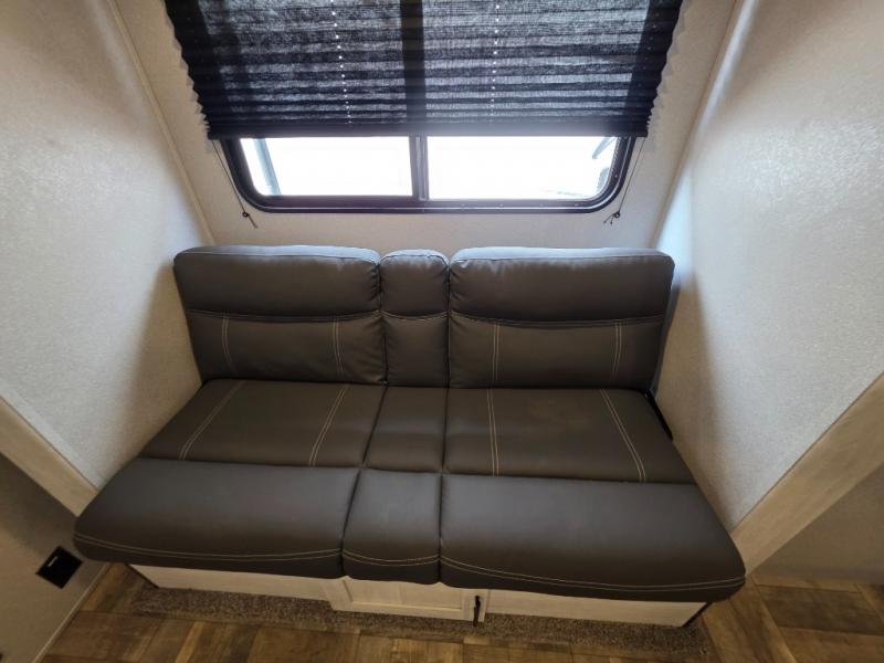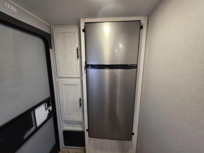 The light cabinetry and a cozy sofa plus the extra floor space from the slide out allow you to relax and unwind before exploring outdoors! There is a pantry and 10 cu. ft. refrigerator as you enter, and the kitchen has an L-shaped counter with extended countertop along one side. There is an entertainment center, a walk-around RV queen bed up front with wardrobes and an overhead cabinet for storage. The rear corner bathroom is complete with a 24" x 40" shower and linen storage. And the pass-through compartment allows for the larger items like camping chairs and outdoor tables, while the power awning provides some protection from the elements.