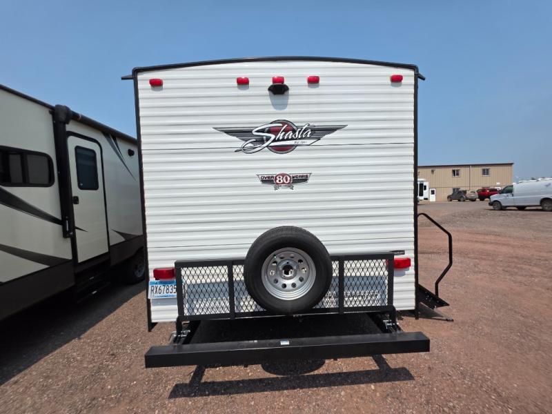 With each Shasta travel trailer by Shasta RVs, premium wood products are used such as 2x2 wall studs on 16" centers and 5/8" thick tongue and groove plywood floors. The 5" wood roof trusses support full walk-on roof decking wrapped with a seamless PVC membrane. Also included is a aerodynamic radius front profile, a front colored rock guard to protect against road debris, a straight axle with electric brakes, molded rain gutter with extra long spouts, a power tongue jack for easy setup, plus an oversized, lighted pass-through compartment with exterior access, and interior access under the bed. The interior offers decorative cabinet pulls, lighted cupholders with two USB chargers, a stainless steel sink, and more providing value and convenience. Rest easy when you purchase a lightweight Shasta that is built to last!