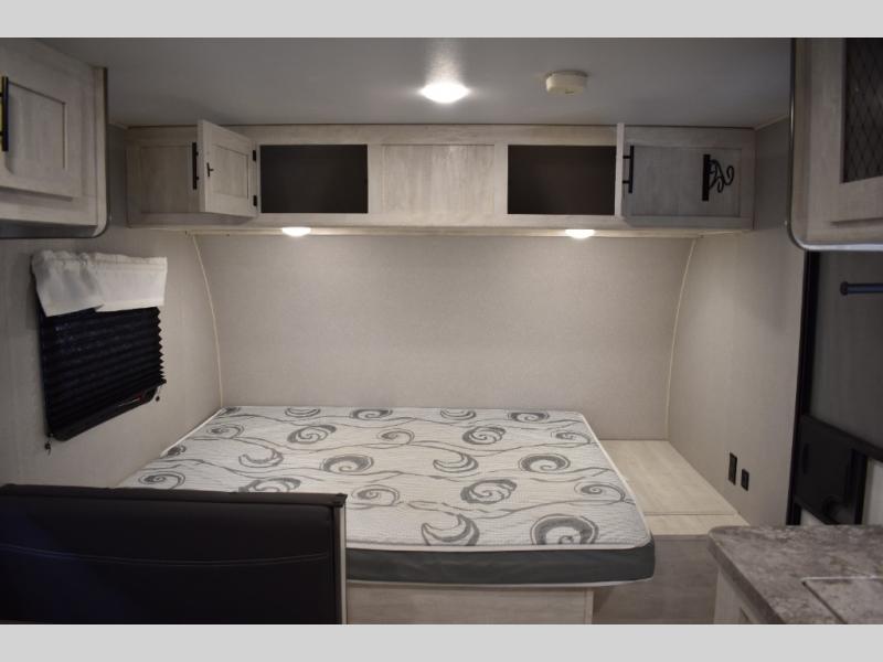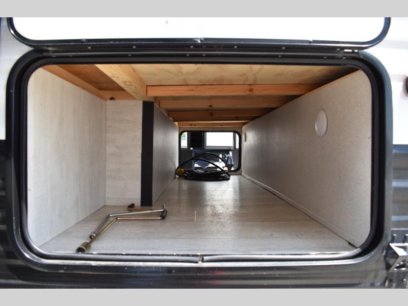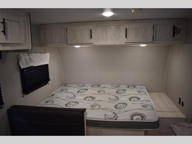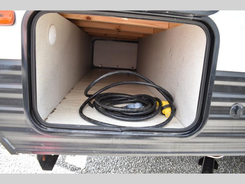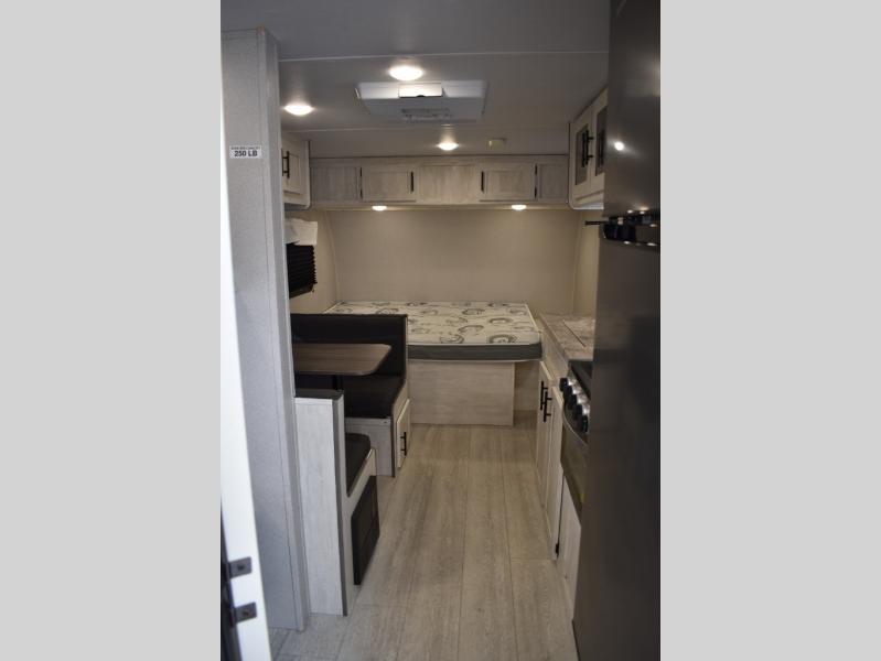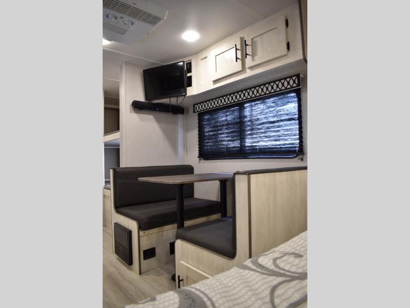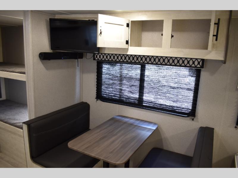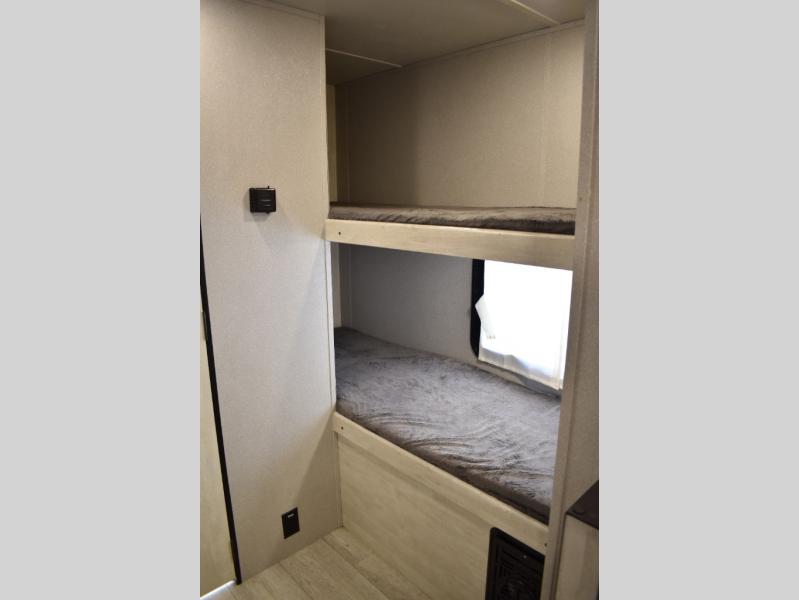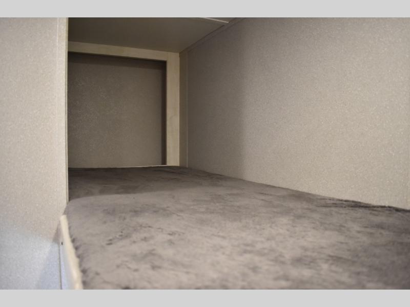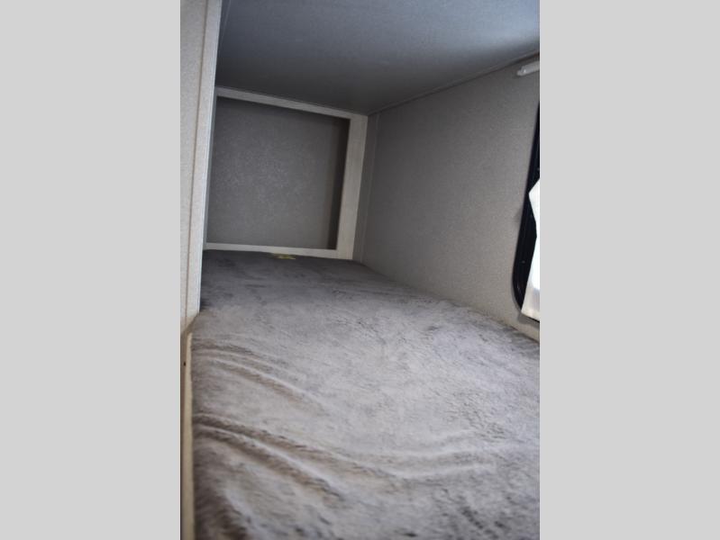 Compact and full of features for you and your family to enjoy camping! There is an RV queen bed up front to sleep comfortably, and a set of bunk beds next to the full bathroom in the rear. Someone might even sleep on the booth dinette once easily setup for nighttime. The galley kitchen offers full amenities to make meals, and you will find storage throughout in overhead cabinets. And you can bring along those larger camping items like fishing poles, camping chairs and outdoor games in the pass-through compartment.