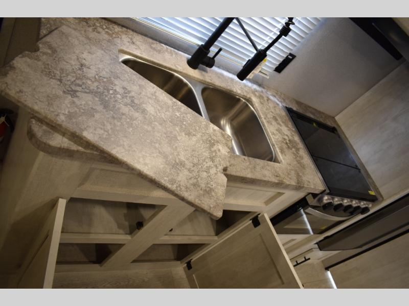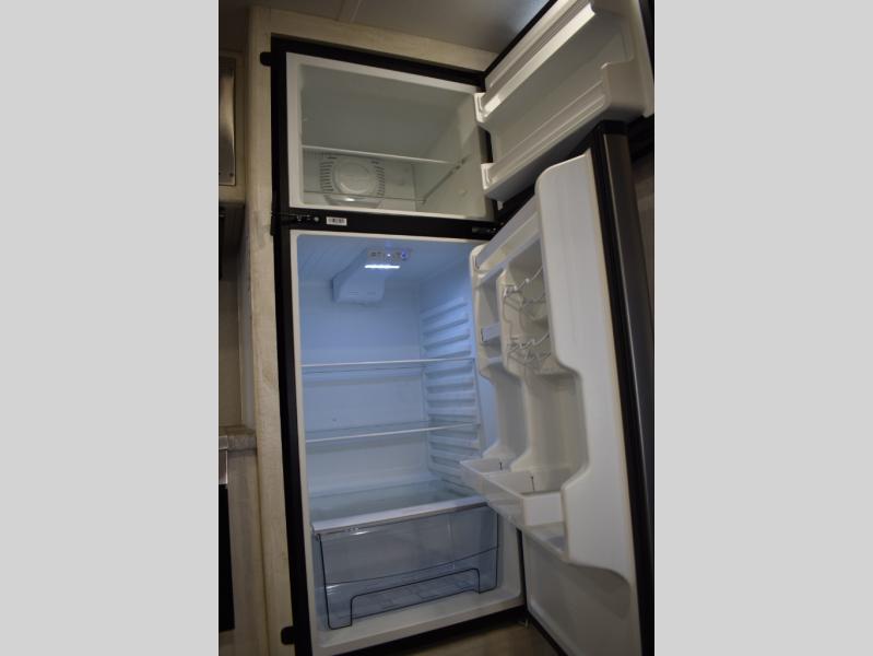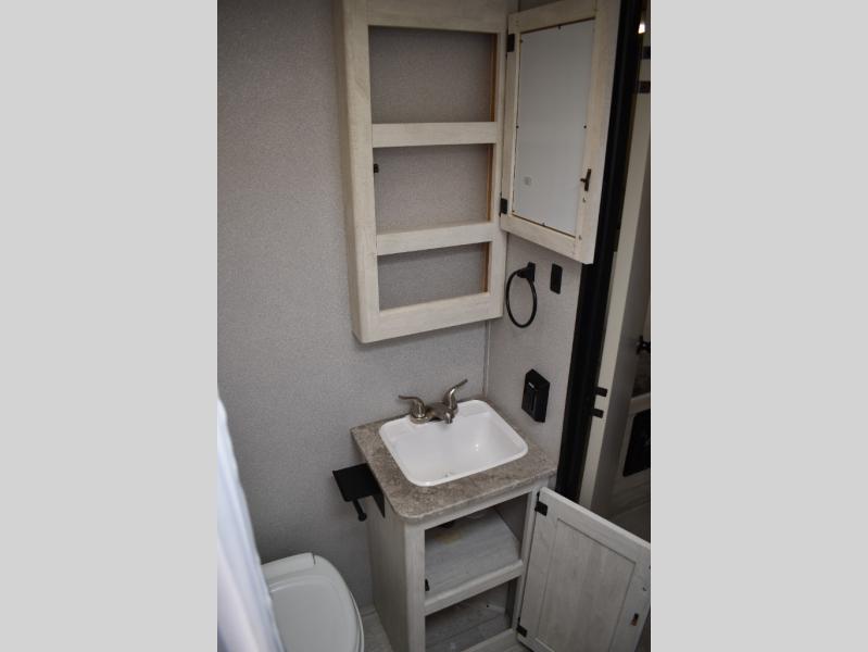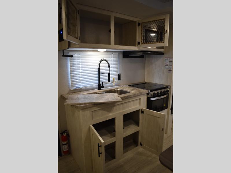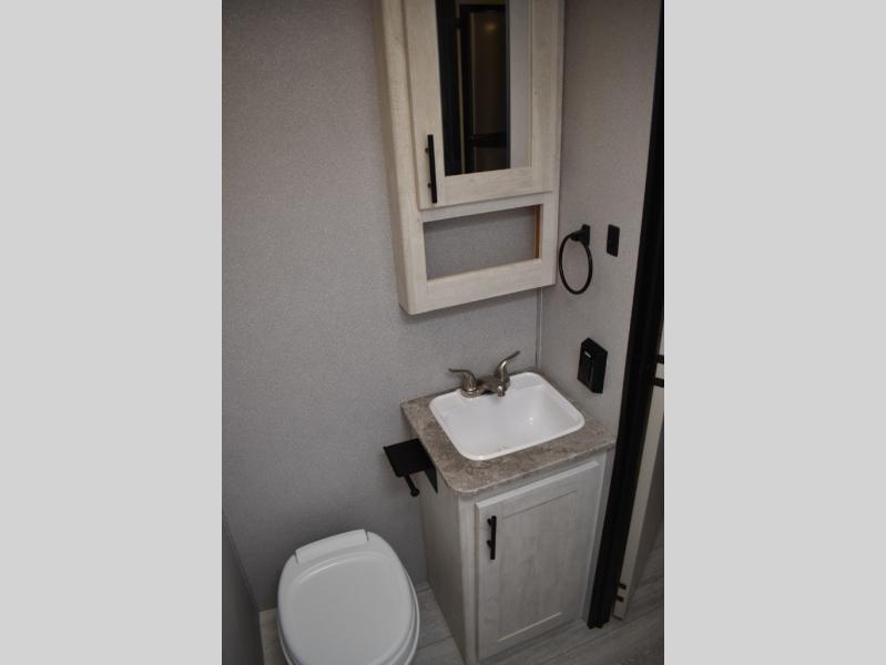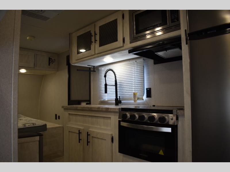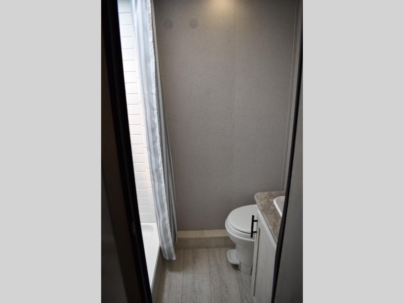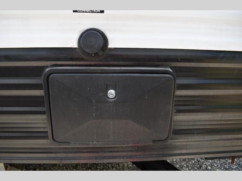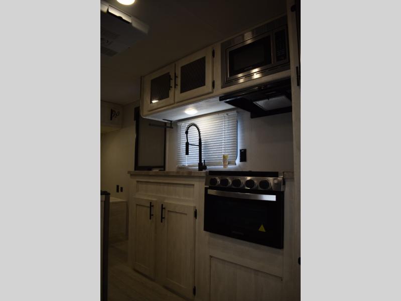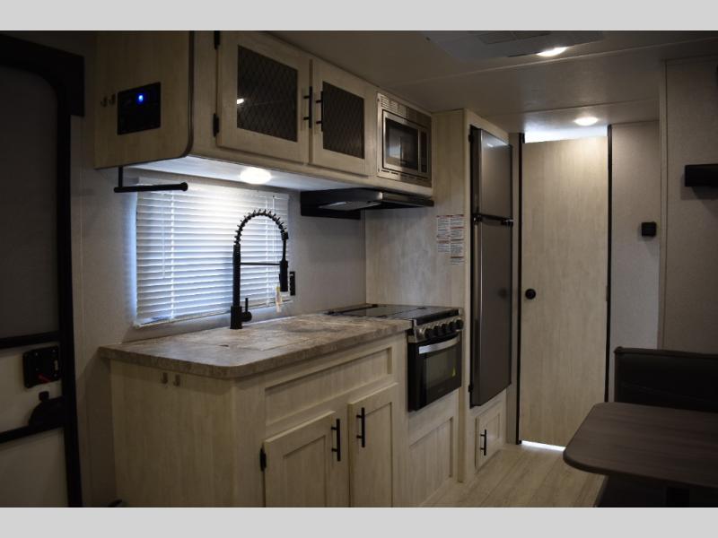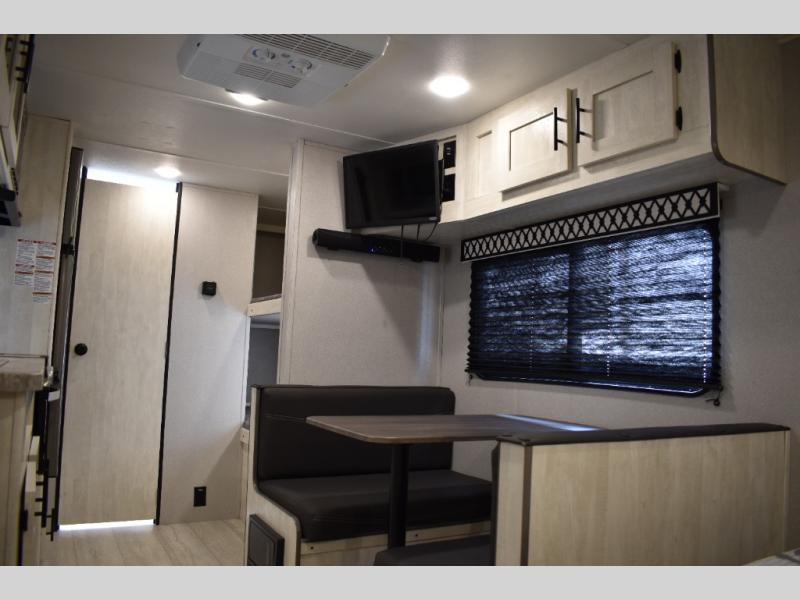 Compact and full of features for you and your family to enjoy camping! There is an RV queen bed up front to sleep comfortably, and a set of bunk beds next to the full bathroom in the rear. Someone might even sleep on the booth dinette once easily setup for nighttime. The galley kitchen offers full amenities to make meals, and you will find storage throughout in overhead cabinets. And you can bring along those larger camping items like fishing poles, camping chairs and outdoor games in the pass-through compartment.