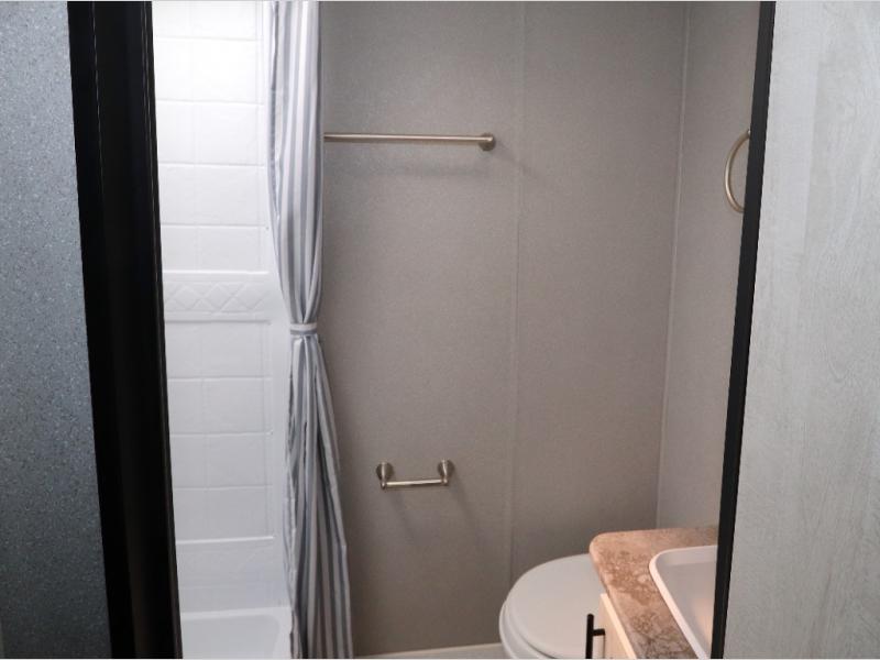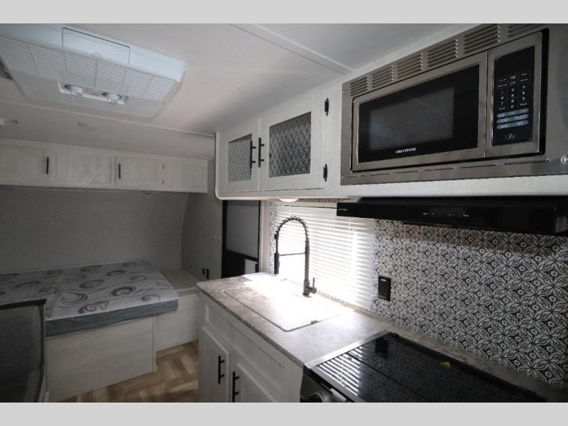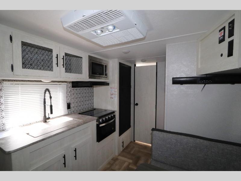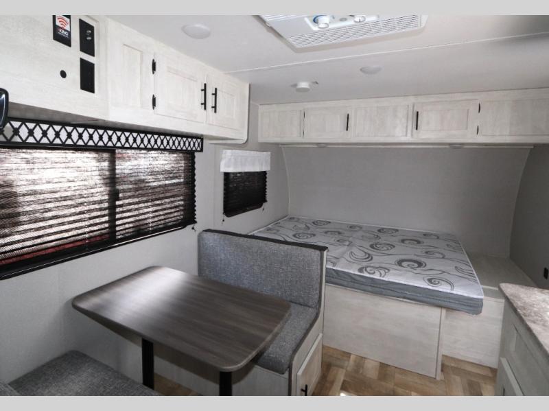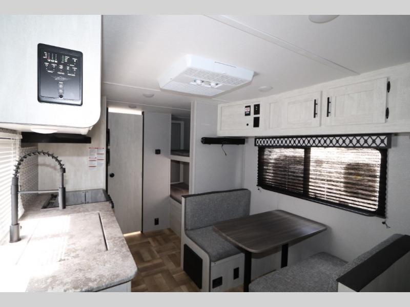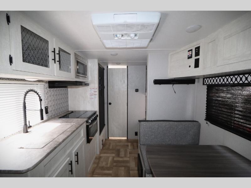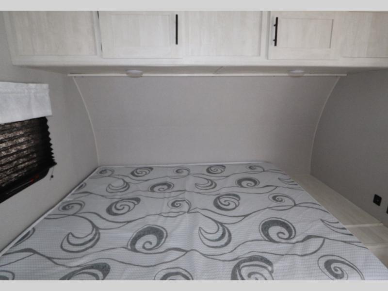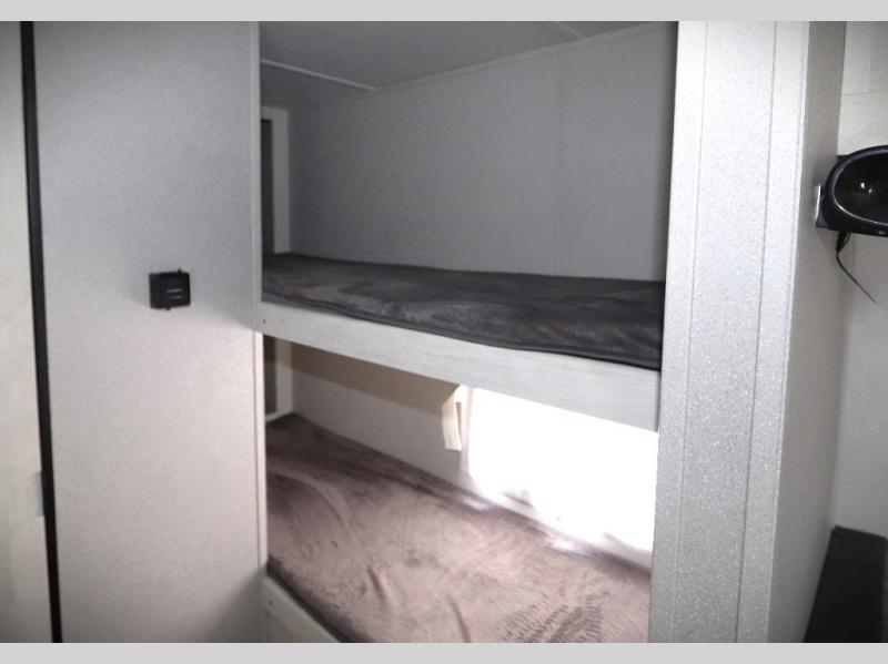 Compact and full of features for you and your family to enjoy camping! There is an RV queen bed up front to sleep comfortably, and a set of bunk beds next to the full bathroom in the rear. Someone might even sleep on the booth dinette once easily setup for nighttime. The galley kitchen offers full amenities to make meals, and you will find storage throughout in overhead cabinets. And you can bring along those larger camping items like fishing poles, camping chairs and outdoor games in the pass-through compartment.