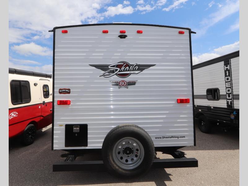 With each Shasta travel trailer by Shasta RVs, premium wood products are used such as 2x2 wall studs on 16" centers and 5/8" thick tongue and groove plywood floors. The 5" wood roof trusses support full walk-on roof decking wrapped with a seamless PVC membrane. Also included is a aerodynamic radius front profile, a front colored rock guard to protect against road debris, a straight axle with electric brakes, molded rain gutter with extra long spouts, a power tongue jack for easy setup, plus an oversized, lighted pass-through compartment with exterior access, and interior access under the bed. The interior offers decorative cabinet pulls, lighted cupholders with two USB chargers, a stainless steel sink, and more providing value and convenience. Rest easy when you purchase a lightweight Shasta that is built to last!