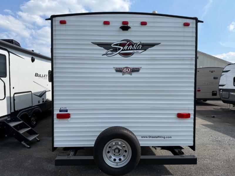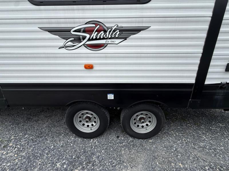With each Shasta travel trailer by Shasta RVs, premium wood products are used such as 2x2 wall studs on 16" centers and 5/8" thick tongue and groove plywood floors. The 5" wood roof trusses support full walk-on roof decking wrapped with a seamless PVC membrane. Also included is a aerodynamic radius front profile, a front colored rock guard to protect against road debris, a straight axle with electric brakes, molded rain gutter with extra long spouts, a power tongue jack for easy setup, plus an oversized, lighted pass-through compartment with exterior access, and interior access under the bed. The interior offers decorative cabinet pulls, lighted cupholders with two USB chargers, a stainless steel sink, and more providing value and convenience. Rest easy when you purchase a lightweight Shasta that is built to last!