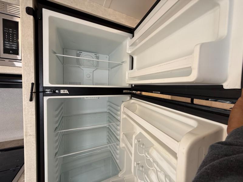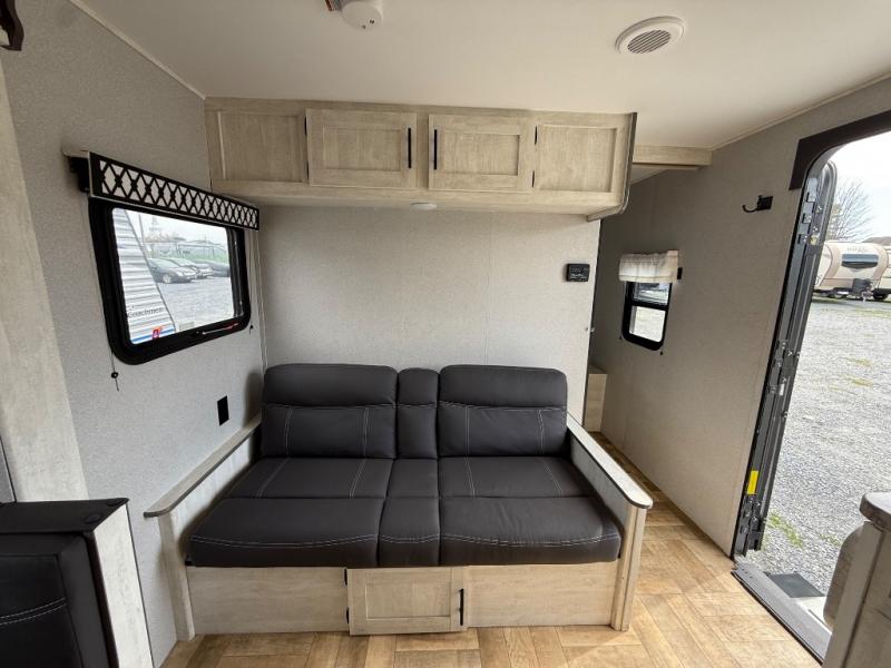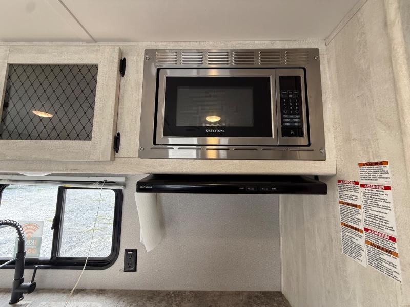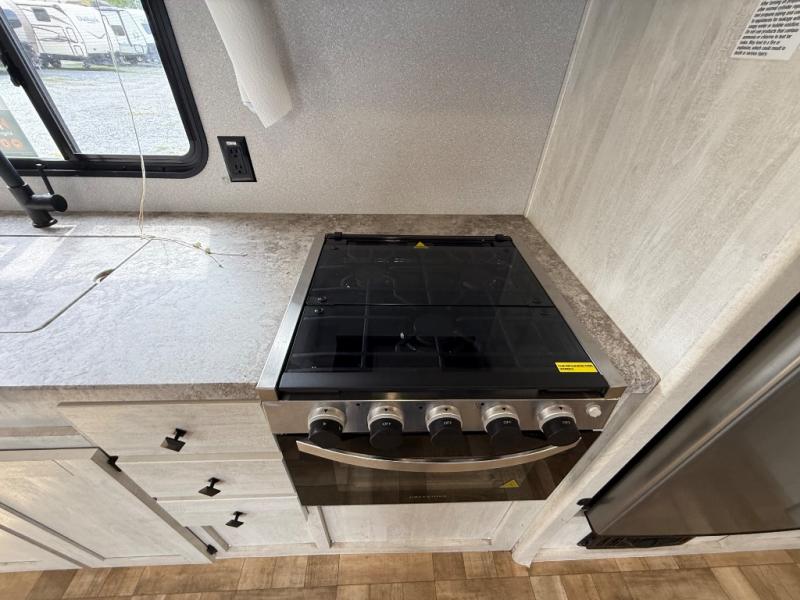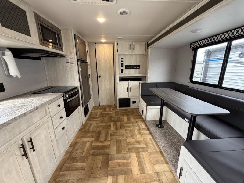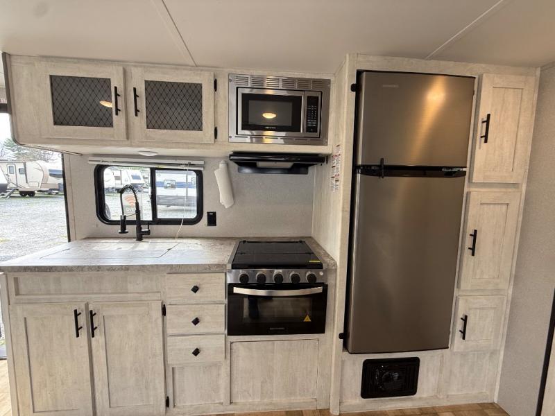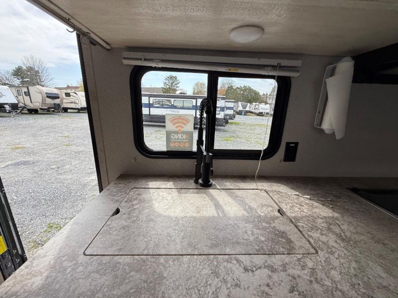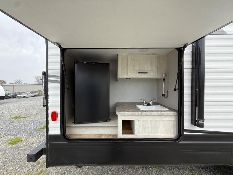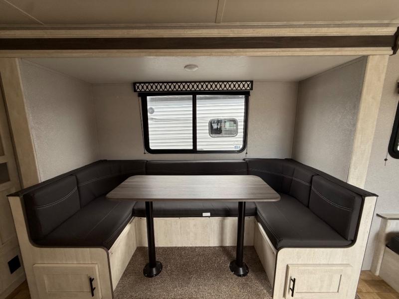 Whether you camp locally or far away, you will be able to enjoy a spacious interior and privacy in this trailer! From the rear full bathroom with upper cabinet and linen storage and a shower to the front bedroom with a door to close when you are ready for bed, privacy is no issue. The walk-around RV queen bed offers dual wardrobes and access to the pass-through storage under the bed. The combined living and kitchen provides more floor space thanks to the slide out U-shaped dinette, and the sofa provides more seating. The cook will love the galley kitchen with everything nearby including a pantry. Yet the outside kitchen will give them choices when making meals.
