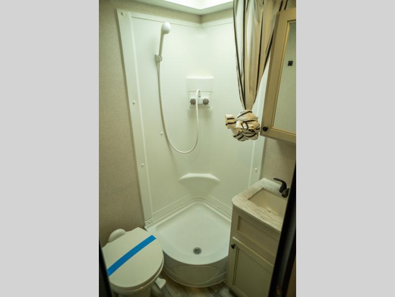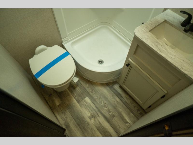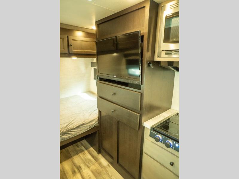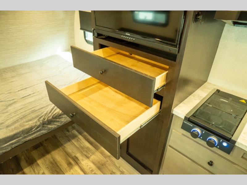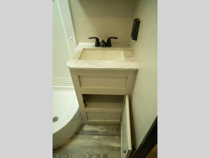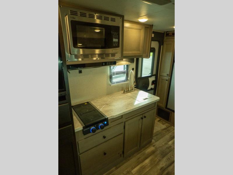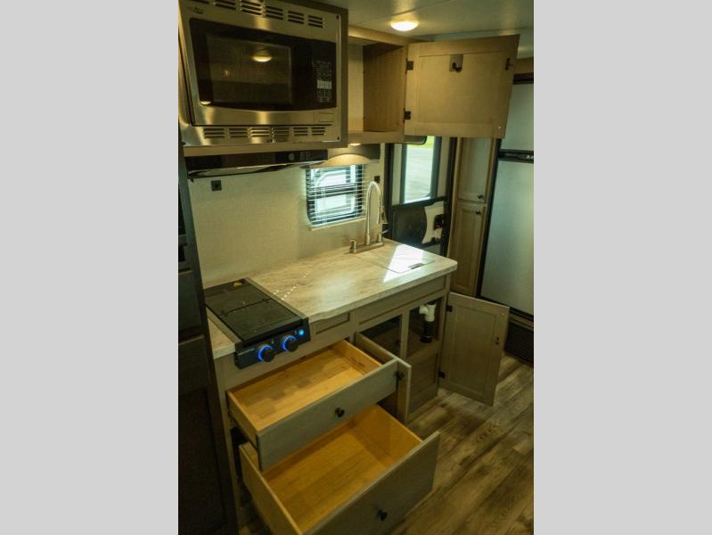 This Super Lite Maxx travel trailer has all of the essentials in an easy-to-tow package! Your interior is outfitted with residential vinyl flooring and hardwood cabinetry, and there are no floor heat registers which makes it very accommodating for kids and pets. The full bathroom has a radius shower which is essential to have if you want to get away in seclusion, and the skylight and roof vent keep the bathroom fresh. The two-burner recessed range and convection microwave will help you keep your belly full, and you can keep the 8-cubic foot refrigerator full of special goodies and healthy foods. You will also find a pantry directly to the left of the entry door.