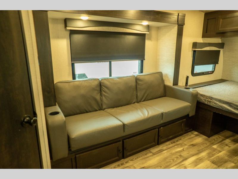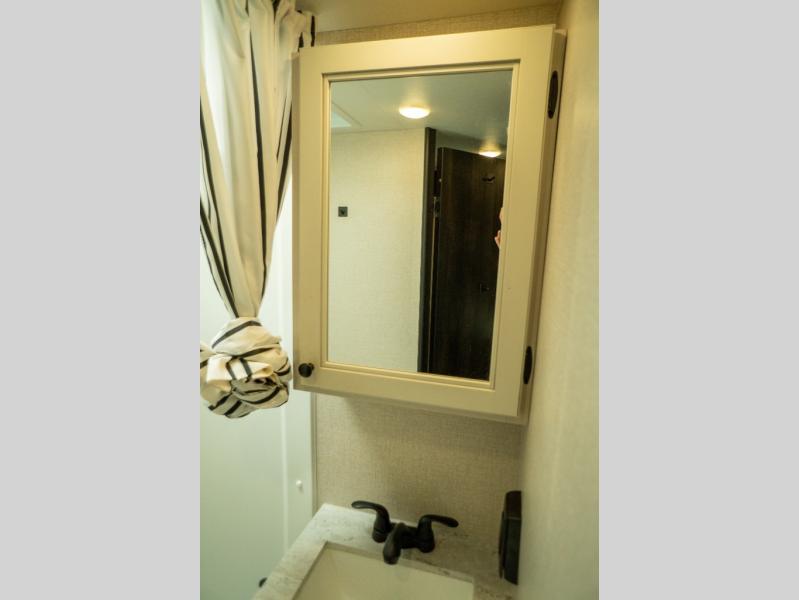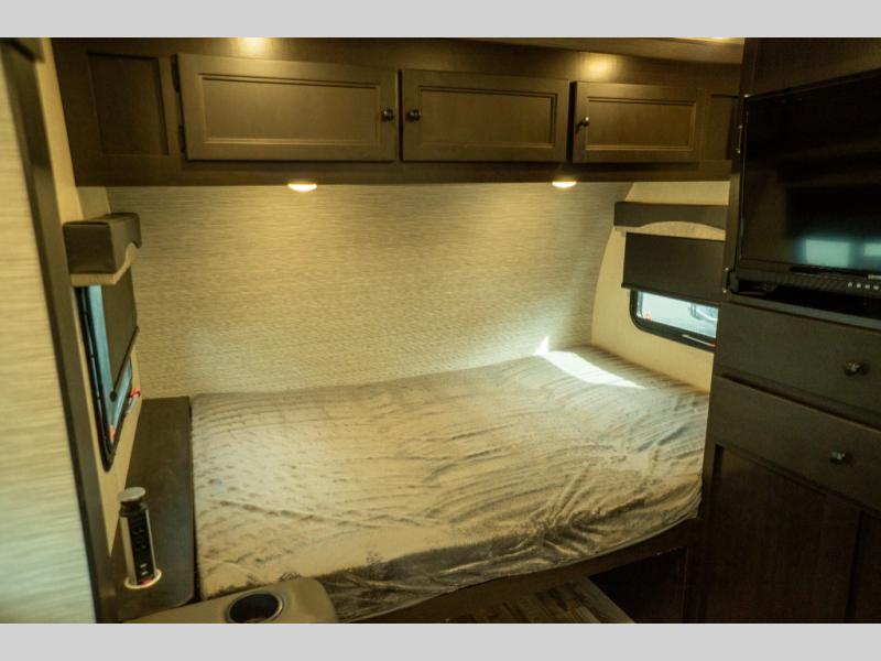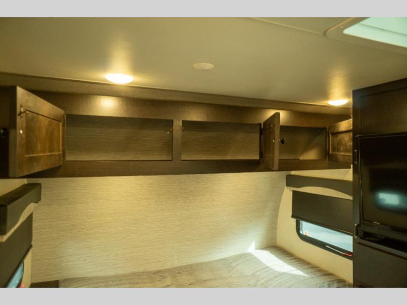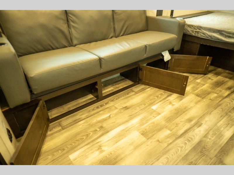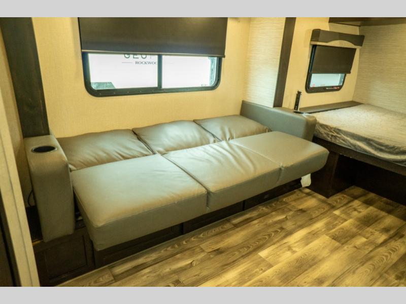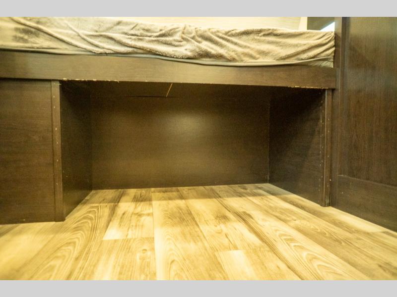 This Super Lite Maxx travel trailer has all of the essentials in an easy-to-tow package! Your interior is outfitted with residential vinyl flooring and hardwood cabinetry, and there are no floor heat registers which makes it very accommodating for kids and pets. The full bathroom has a radius shower which is essential to have if you want to get away in seclusion, and the skylight and roof vent keep the bathroom fresh. The two-burner recessed range and convection microwave will help you keep your belly full, and you can keep the 8-cubic foot refrigerator full of special goodies and healthy foods. You will also find a pantry directly to the left of the entry door.