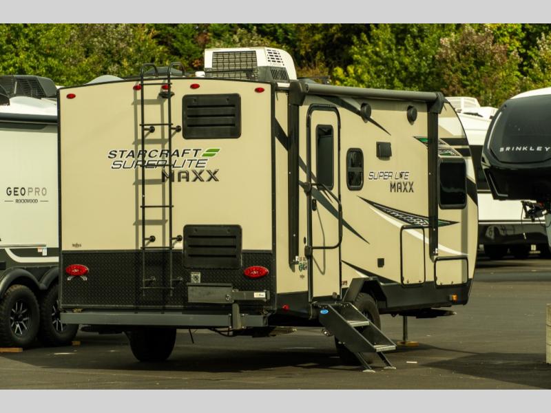 If you want to power up your camping experiences, take it to the max with the Starcraft Super Lite Maxx travel trailer! Each unit is built to last with a Magnum Roof system, PVC roofing membrane, and a TuffShell exterior which is a vacuum-bonded laminated construction, reinforced with heavy-duty fiberglass and welded aluminum frames. The 15" nitrogen-filled off-road radial tires with aluminum rims, impact-resistant galvanized steel wheel wells, and rubber torsion axle with increased ground clearance adjustments are great additions that allow the Super Lite Maxx to take adventures off the beaten path. Transform your campsite into the party space everyone wants to be a part of by using the marine-grade exterior speakers and power awning, and add the optional Off-Grid Solar Package if you want to take advantage of natural energy. You can also add an optional Wi-Fi router too!
