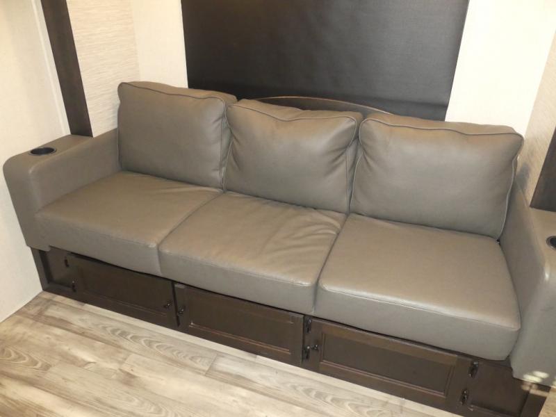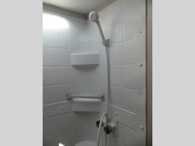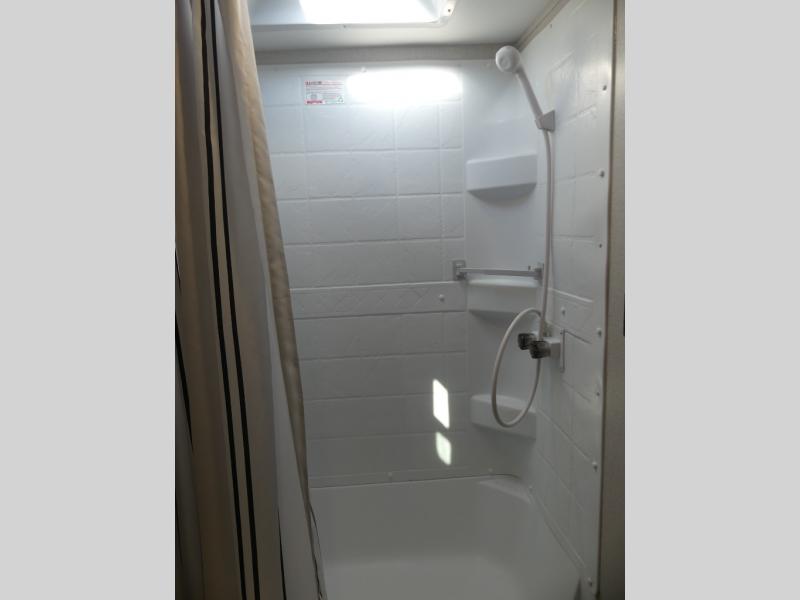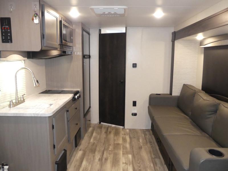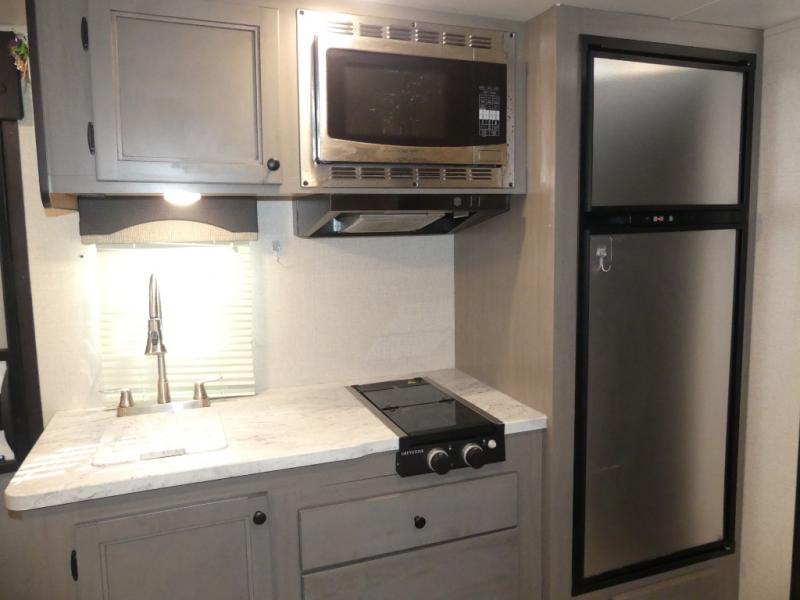 Anytime you take this Super Lite Maxx travel trailer out to the campsite, you'll feel good about the decision! This trailer makes life easy with its skylight and tub/shower in the full rear bathroom, its two-burner recessed range and convection microwave in the kitchen, and its jackknife sofa and 80" bed for sleeping. Another great aspect of this trailer is its storage space. There is a bathroom linen closet, overhead cabinets, an 8-cubic foot refrigerator, and exterior storage compartments. The residential vinyl flooring will be easy to clean if any messes are made, and since there are no floor heat registers, this trailer is very accommodating for kids and pets.