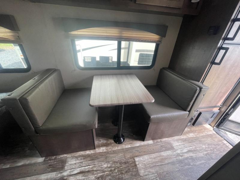 Pack your bags and load up this travel trailer for a great camping trip! You will have everything you need to keep your belly full with the two burner cooktop, your hair clean with a tub inside the full bathroom which also has a power vent fan, and your body well rested after sleeping on the front 60" x 74" queen bed. You can even play card games at the booth dinette or transform it into an extra sleeping space. There is also an outside shower to rinse the mud off your feet before entering inside!