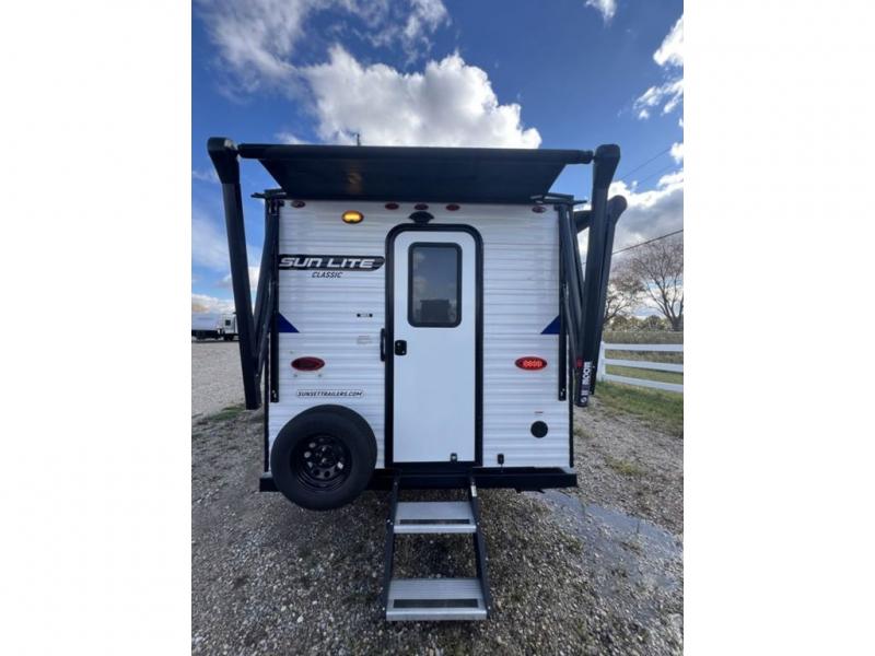 You can trust the build and enjoy your experience with any one of these Sunset Park RV Sun-Lite Classic travel trailers! Their aerodynamic profile is not only easy to haul, but also saves on fuel. They are built to withstand years of traveling even though they are lightweight with a diamond plate rock guard, a one piece PVC roof membrane, EZ lube electric brake axles, and radius tinted safety glass windows with nightshades for added privacy. The mandatory Comfort package includes a Bluetooth radio with inside and outside speakers, a quick connect gas line, a microwave, and an outside shower to help keep the dirt outdoors where it belongs.