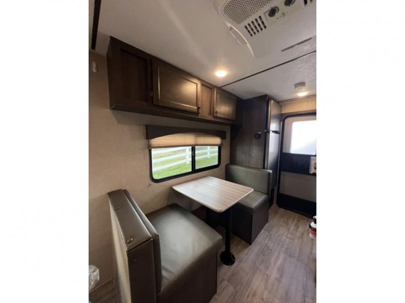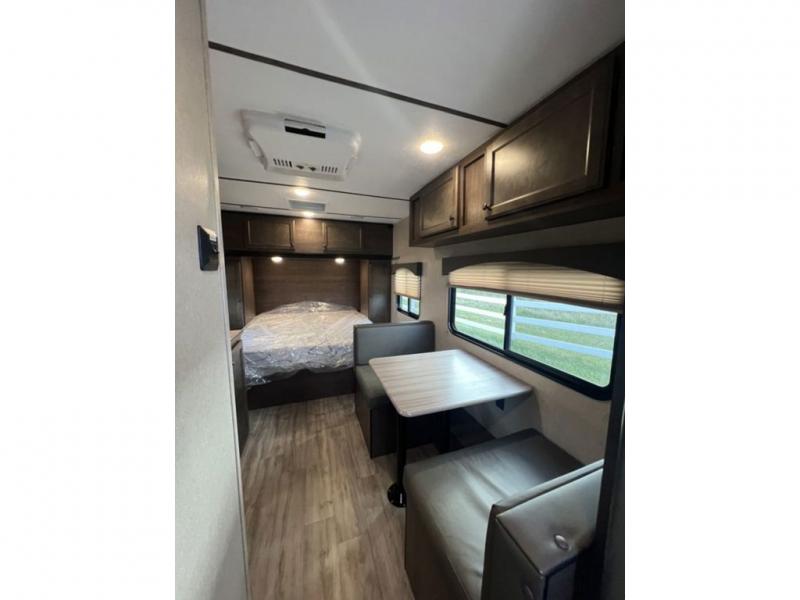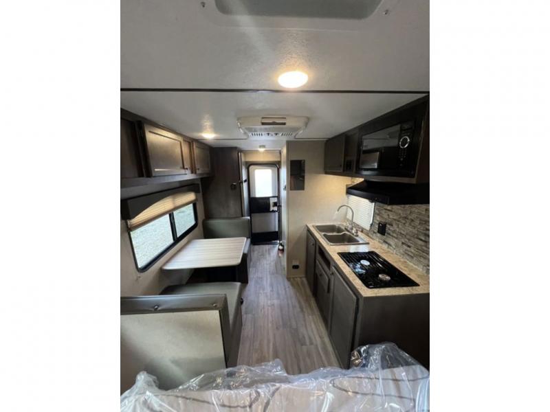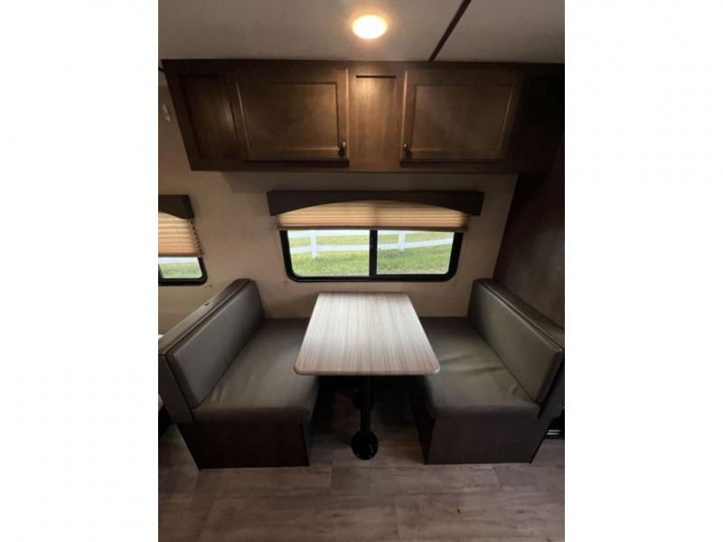 Pack your bags and load up this travel trailer for a great camping trip! You will have everything you need to keep your belly full with the two burner cooktop, your hair clean with a tub inside the full bathroom which also has a power vent fan, and your body well rested after sleeping on the front 60" x 74" queen bed. You can even play card games at the booth dinette or transform it into an extra sleeping space. There is also an outside shower to rinse the mud off your feet before entering inside!