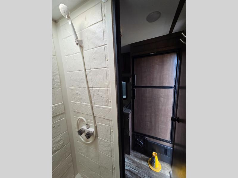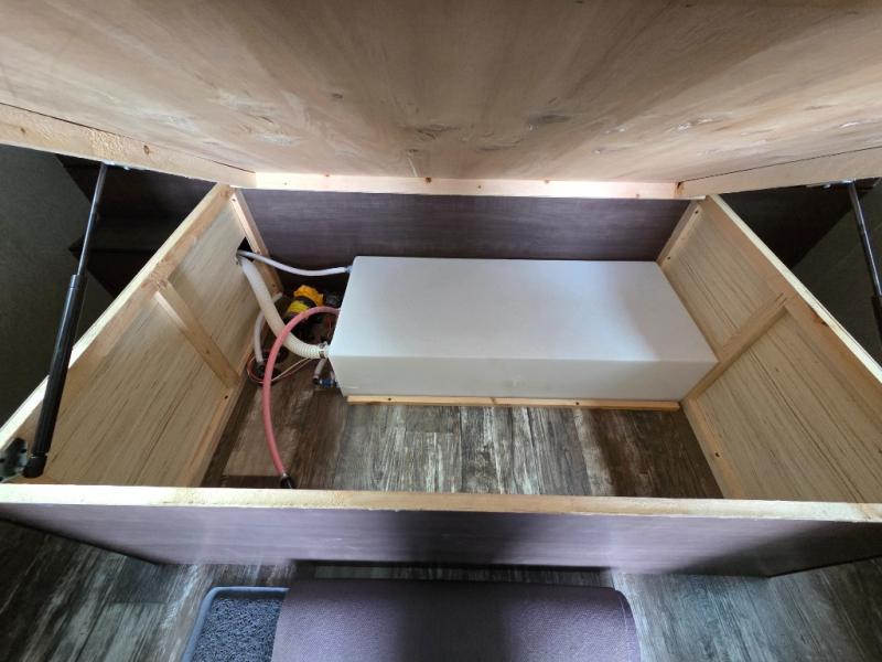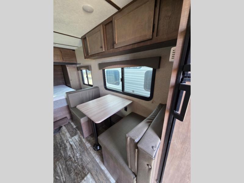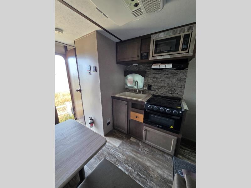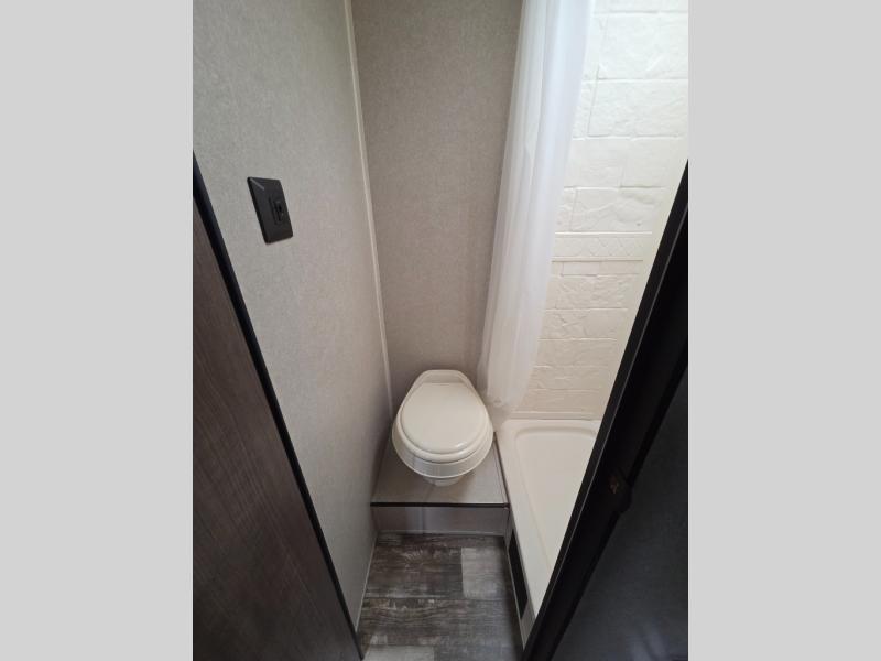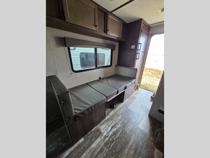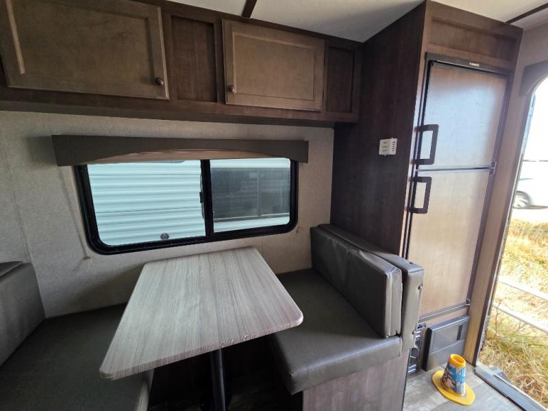 Pack your bags and load up this travel trailer for a great camping trip! You will have everything you need to keep your belly full with the two burner cooktop, your hair clean with a tub inside the full bathroom which also has a power vent fan, and your body well rested after sleeping on the front 60" x 74" queen bed. You can even play card games at the booth dinette or transform it into an extra sleeping space. There is also an outside shower to rinse the mud off your feet before entering inside!