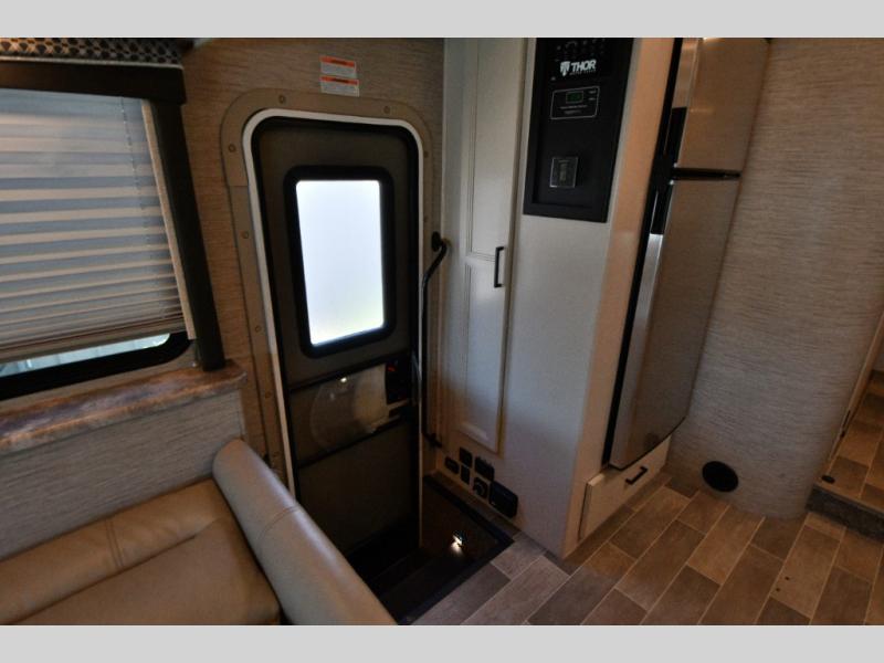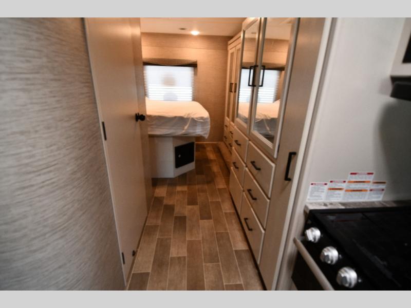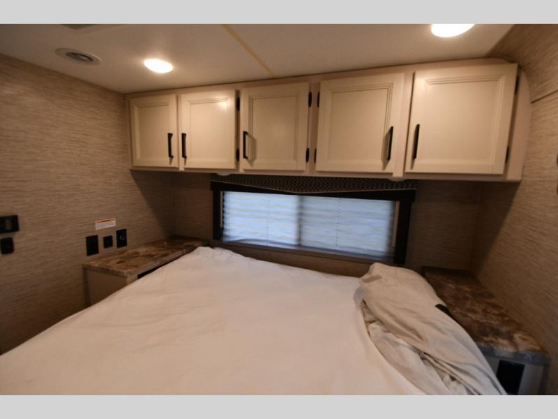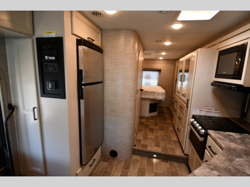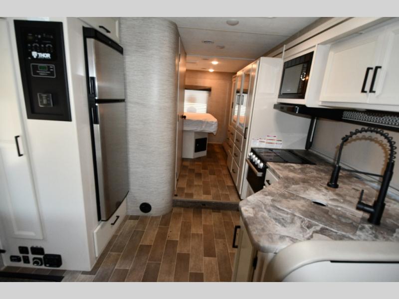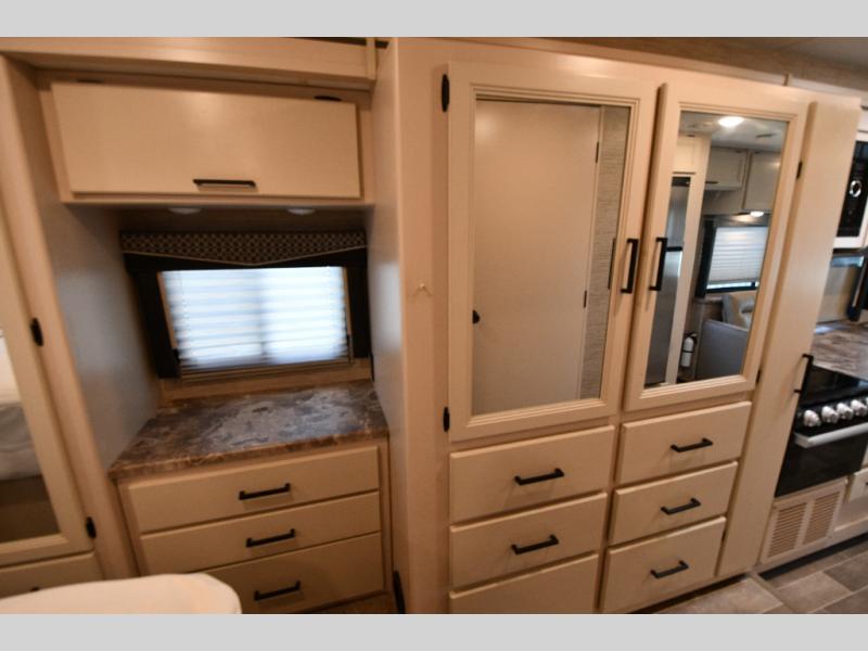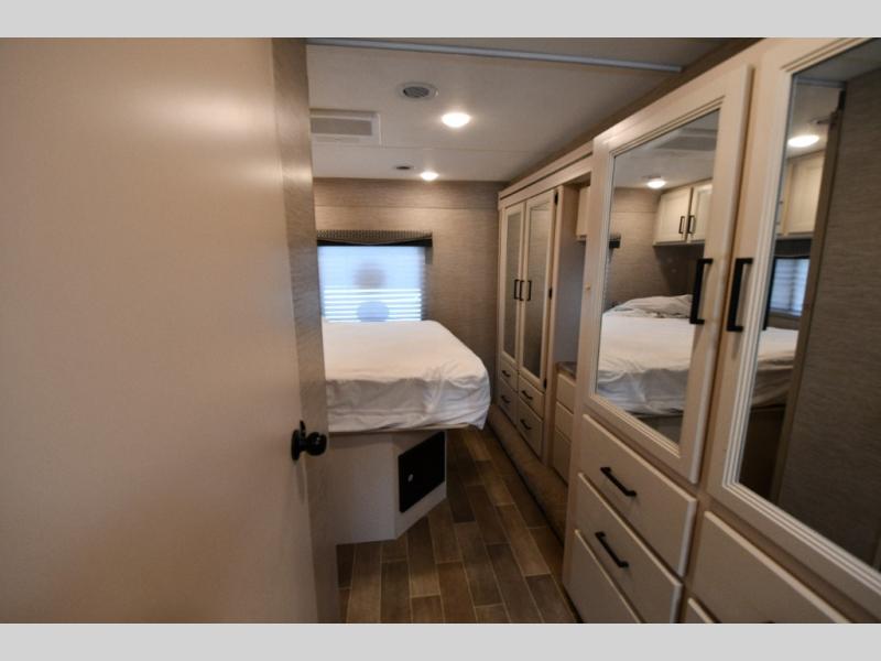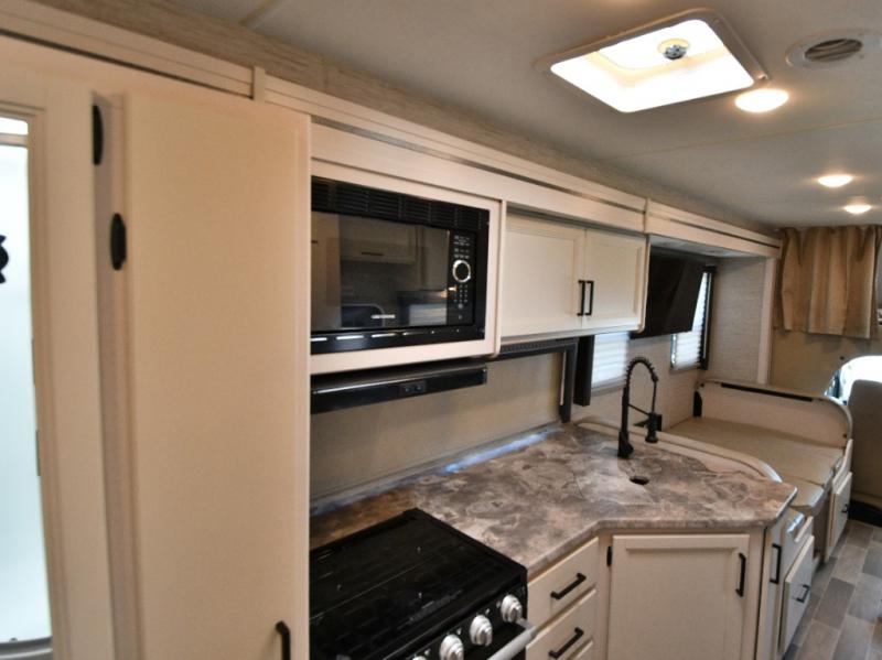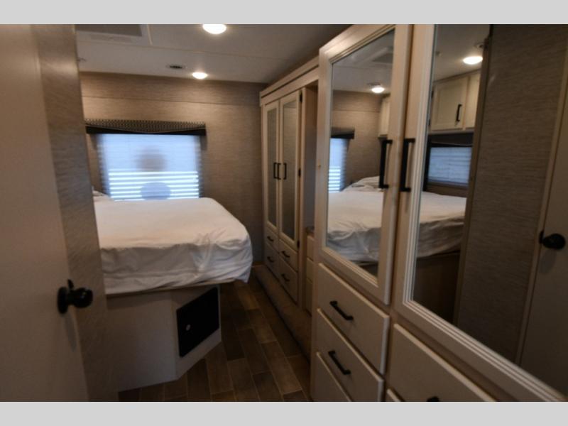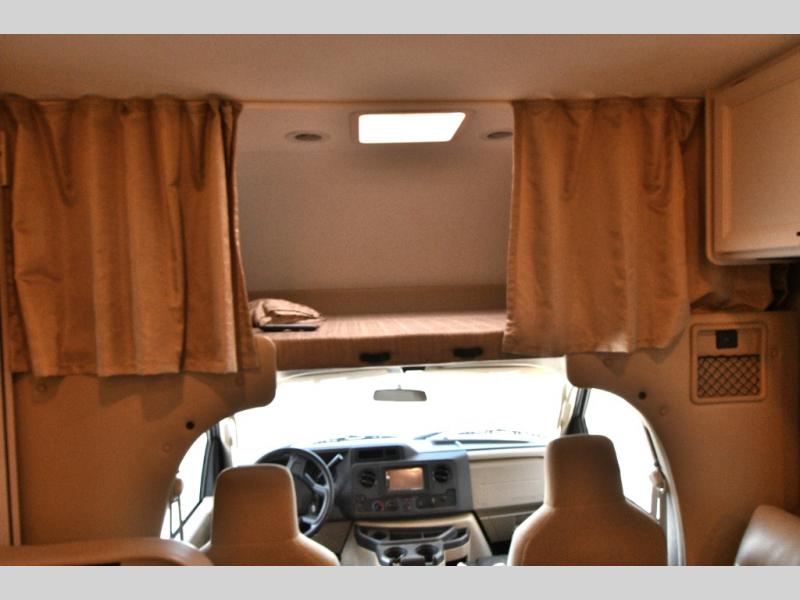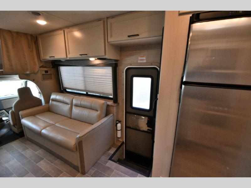 Step inside the pre-owned 2022 Thor Chateau 31WV and enjoy a Class C motorhome designed for family adventures and everyday comfort. This 31-foot coach sleeps up to six with a rear private queen bedroom, bunk-over-cab, and convertible dinette and sofa sleepers. The private rear bedroom features a sliding door, closet, dresser, and TV prep for added convenience. Large windows and a skylight fill the cabin with natural light, making the interior feel open and airy.