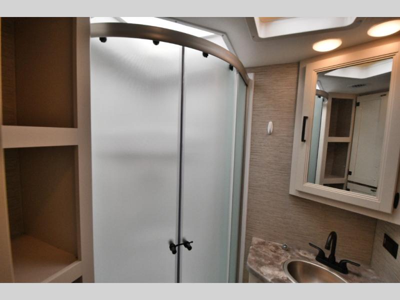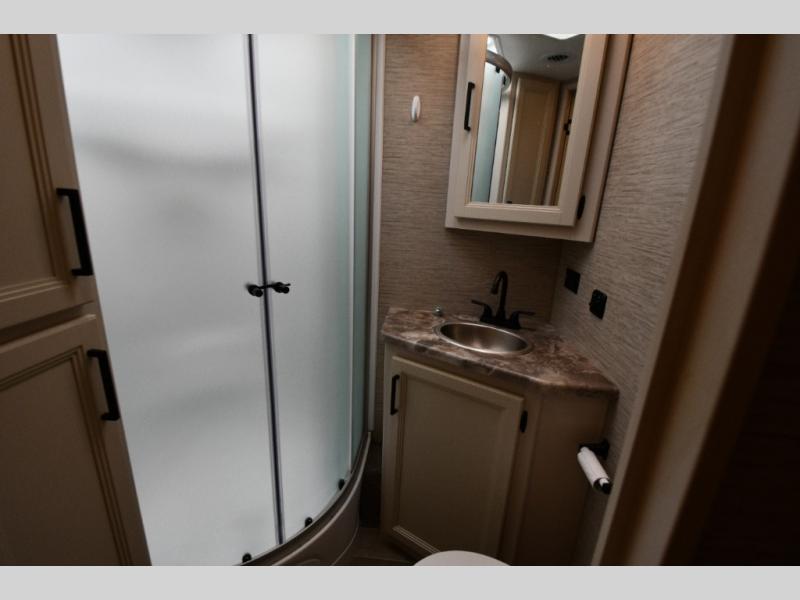 The living and dining areas include a Dream Dinette booth and a lounge sofa positioned for easy viewing of the smart TV above the dinette. The L-shaped kitchen features an undermount stainless steel sink, 3-burner cooktop with glass cover, mid-size refrigerator with auto generator start, and cherry-glazed residential-style cabinetry. A centrally located full bathroom offers a 32" circular shower, tankless water heater, porcelain toilet, sink, medicine cabinet, and storage to keep your essentials organized. With only 6,133 miles, this coach is ready for your next adventure.