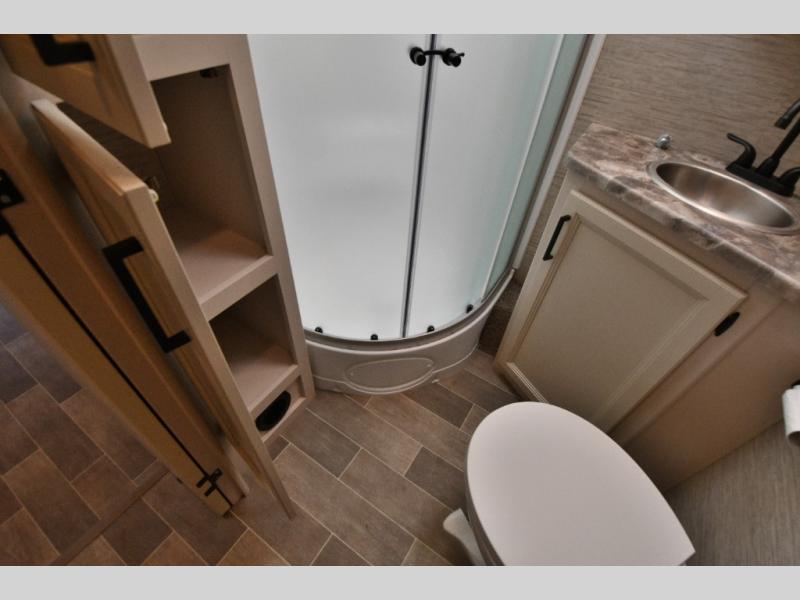 Full bathroom with circular shower, tankless water heater, porcelain toilet, and storage