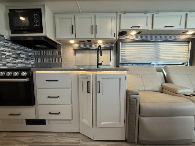 The A.C.E Class A gas motorhome is constructed with a welded tubular steel floor, vacu-bond laminated roof, walls and floor with block foam insulation, and a premium one-piece exterior roof for a coach made to last. You will love the pet-friendly features, like the Bird's Eye window, the Pet-Link multi-purpose tie-down and the Pull-Out Kibble Station with an FDS approved pet bowl liner. Each model includes an Onan RV QG 4,000 gas generator, a Winegard ConnecT Wi-Fi extender +4G, and are pre-wired for solar charging. Some of the other convenient amenities you will find on the A.C.E are frameless windows, a basement pass-through storage, and an exterior LP connection. Head inside to find residential vinyl flooring, pressed laminate countertops, glass tile backsplash in the kitchen, and a designer headboard, bedspread and pillow shams in the bedroom for all-around comfort!