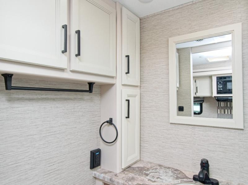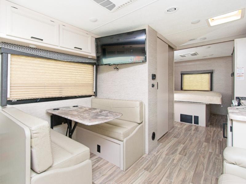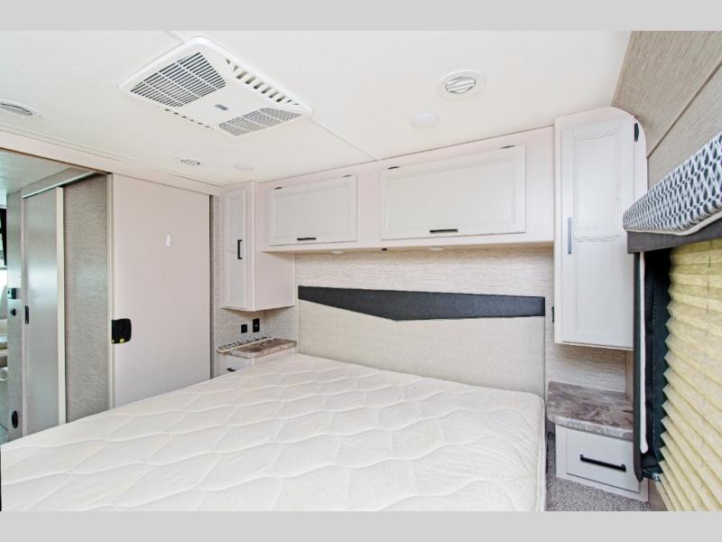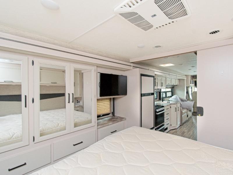 After a day of adventure, retreat to the private rear bedroom featuring a plush king-size bed, a spacious dresser, and a 32" TV for evening entertainment. The drop-down overhead bunk adds extra sleeping space, making this motorhome ideal for families or guests.
