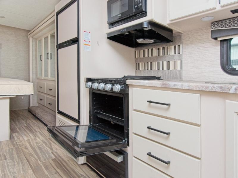 Whether you choose the standard jack-knife sofa or upgrade to optional theater seating, you'll have a cozy spot to relax. The kitchen is fully equipped with a three-burner gas cooktop, microwave oven, and a double-door refrigerator, while the exterior kitchen adds convenience with a fridge, sink, and 1000-watt inverter—perfect for outdoor meals and tailgating.