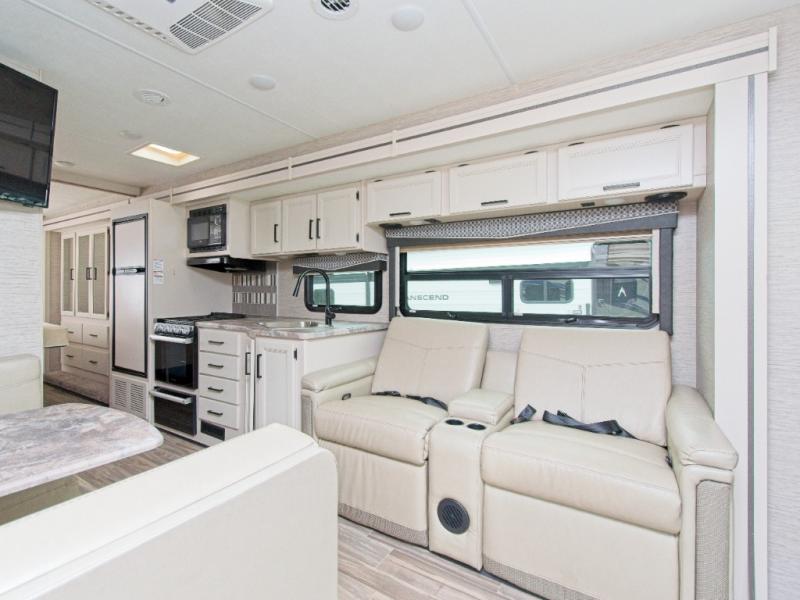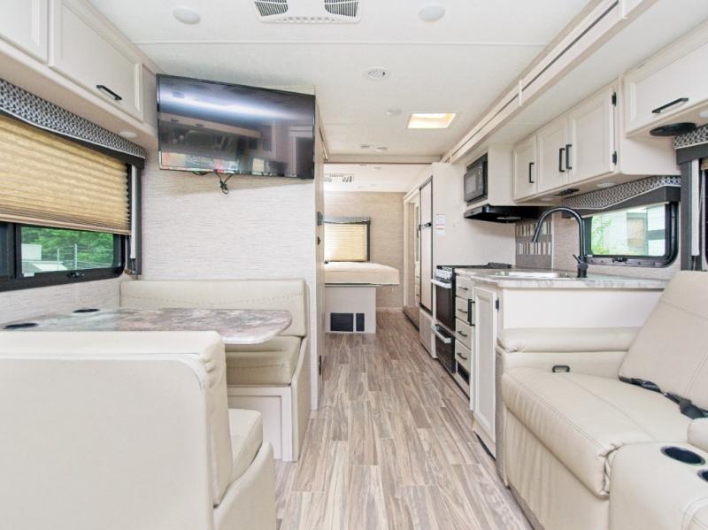 Hit the road in style with the Thor A.C.E. 29.5, featuring a spacious full-wall slide and a private rear bedroom with a king-size bed and 32" TV for ultimate comfort.