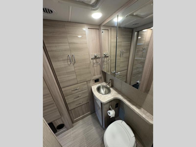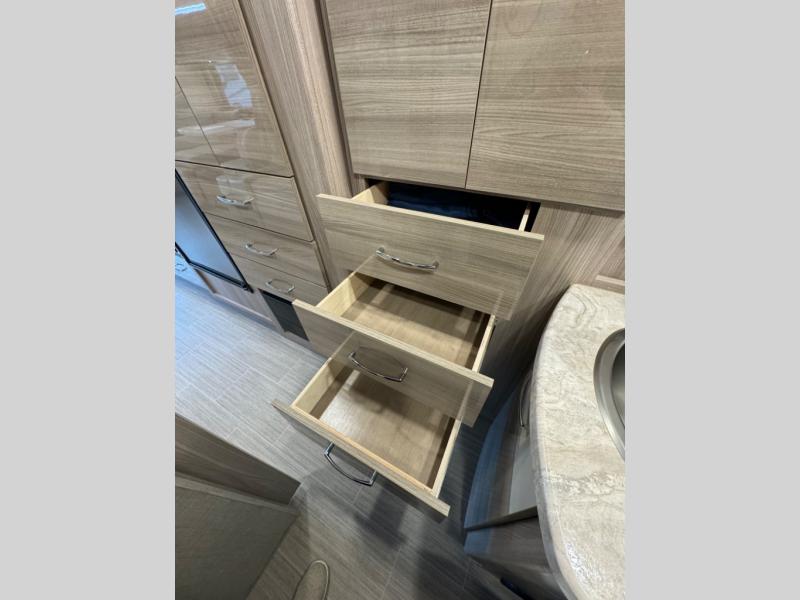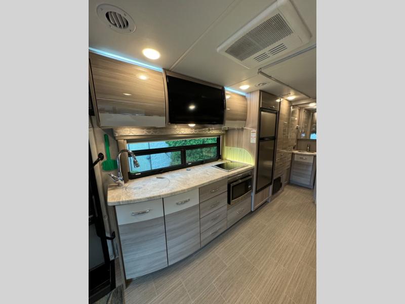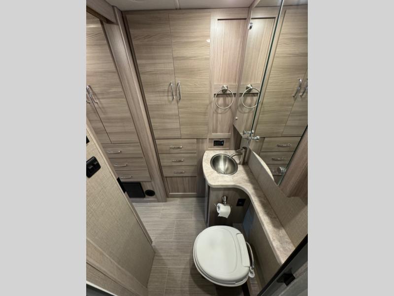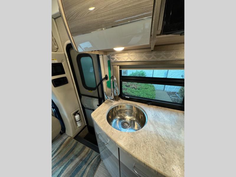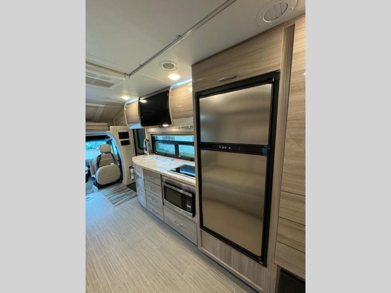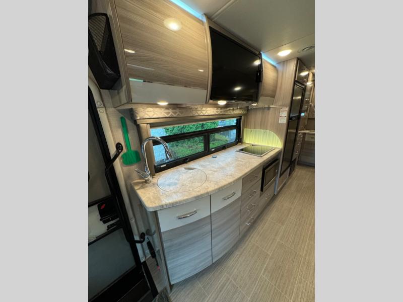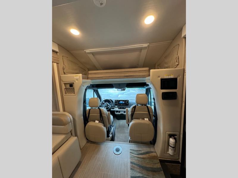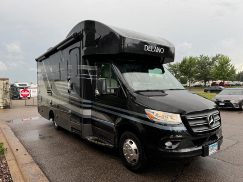Luxury comes standard in the Delano Sprinter Class C diesel motorhomes by Thor Motor Coach. You will find it so easy to maneuver the road with the Mercedes-Benz Safety Package that includes features such as active braking assist and distance regulator distronic plus that will help keep a safe distance from vehicles in front of you. The frameless windows and the full-body paint package with gel coated sidewalls is sure to be eye-catching, plus there is invisible front paint protection for added defense against the elements. Each model includes the Rapid Camp+ multiplex wiring control system that will make set-up easier than ever, a Winegard ConnecT 2.0 WiFi/4G/TV antenna to keep you connected to the outside world, and a whole coach water filtration system for fresh H2O day or night. The Delano Sprinter also includes many interior comforts, like the easy-to-clean residential vinyl flooring, the high-gloss Euro-style cabinetry, and the Leatherette furniture!