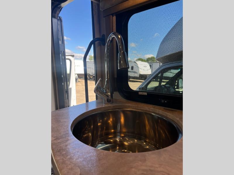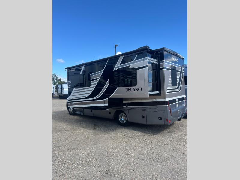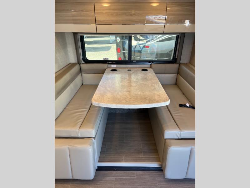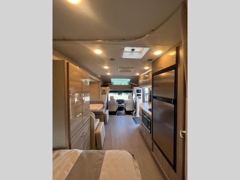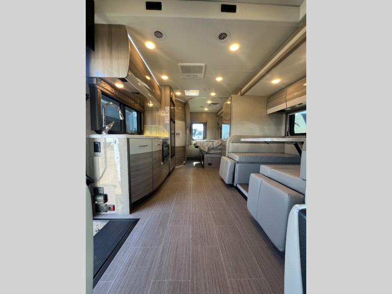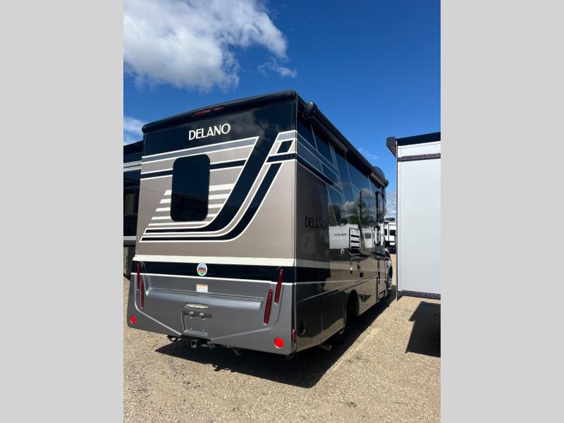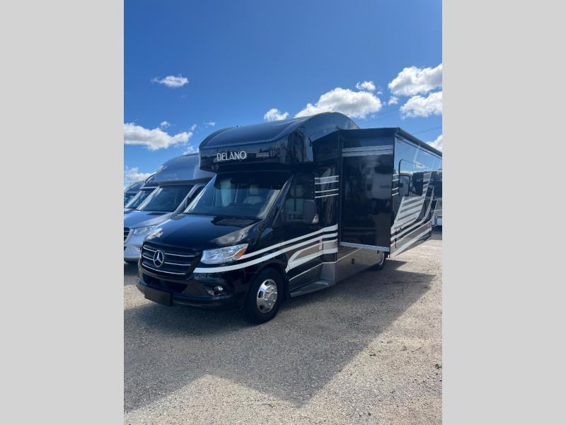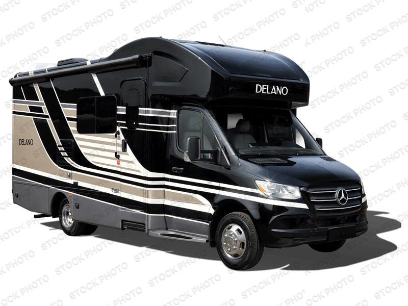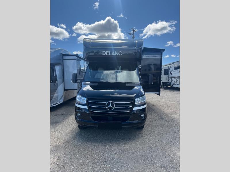 Luxury comes standard in the Delano Sprinter Class C diesel motorhomes by Thor Motor Coach. You will find it so easy to maneuver the road with the Mercedes-Benz Safety Package that includes features such as active braking assist and distance regulator distronic plus that will help keep a safe distance from vehicles in front of you. The frameless windows and the full-body paint package with gel coated sidewalls is sure to be eye-catching, plus there is invisible front paint protection for added defense against the elements. Each model includes the Rapid Camp+ multiplex wiring control system that will make set-up easier than ever, a Winegard ConnecT 2.0 WiFi/4G/TV antenna to keep you connected to the outside world, and a whole coach water filtration system for fresh H2O day or night. The Delano Sprinter also includes many interior comforts, like the easy-to-clean residential vinyl flooring, the high-gloss Euro-style cabinetry, and the Leatherette furniture!