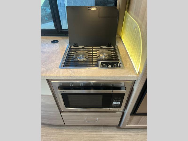 One look at this full-wall slide out coach and you'll be hooked! The swivel captain's seats can become a part of the living area once you're parked, and your guests can sit at the 76" Dream Dinette with footrests. Prepare lunch on the two burner gas cooktop, or use the convenient convection microwave. You'll find a large closet that can be used for clothes, food, or miscellaneous camp gear, plus there are overhead compartments for even more storage. The cab-over bunk provides additional sleeping space, and you'll enjoy the flip-up queen bed in the bedroom, along with a 32" TV.