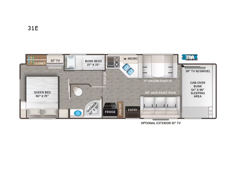 | TV Info | Cab 39" TV w/Swivel, BR 32" TV |