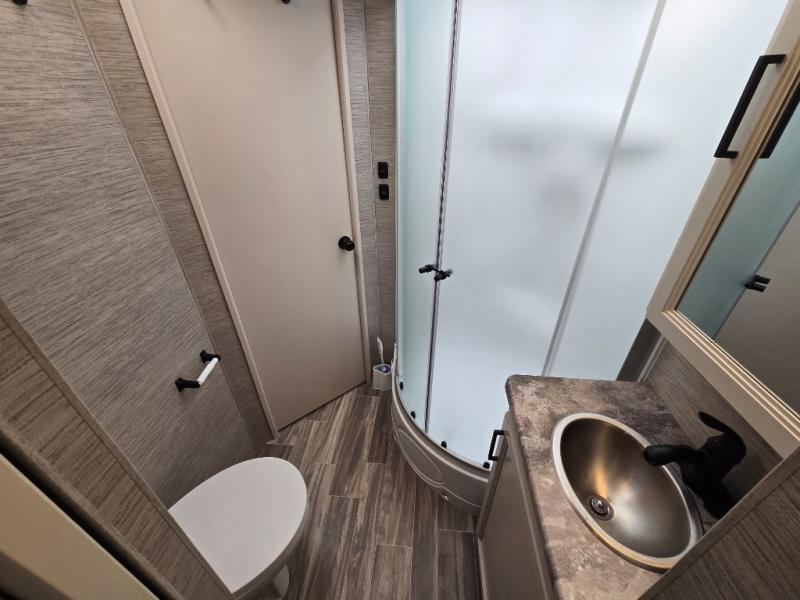 Looking for all the bells and whistles, well you might have found it in this coach! The included Premier Package provides features such as a whole coach water filtration system, a tankless water heater, and frameless windows. You can rest easy in your own queen bed in the rear bedroom with access to the double entry bathroom, your kids or guests will enjoy the bunk beds and cab over bunk to sleep on, plus the dream dinette and jack-knife sofa offer even more sleeping space. And the kitchen amenities will impress anyone as they enter the mid-coach entrance.
