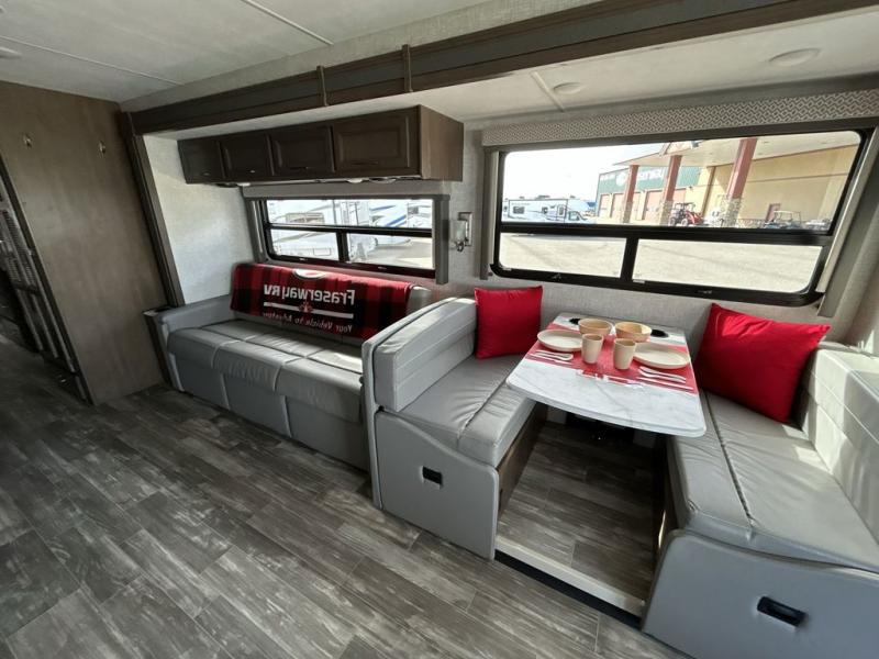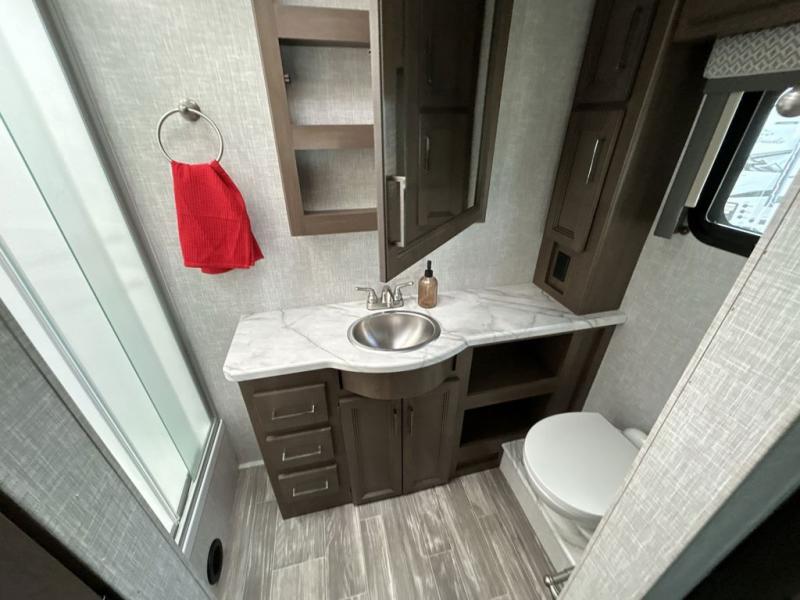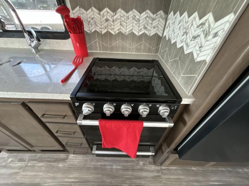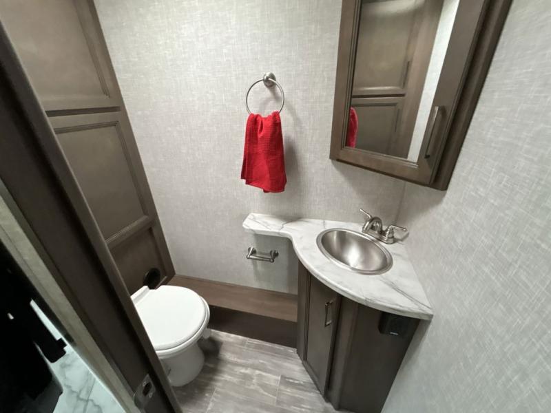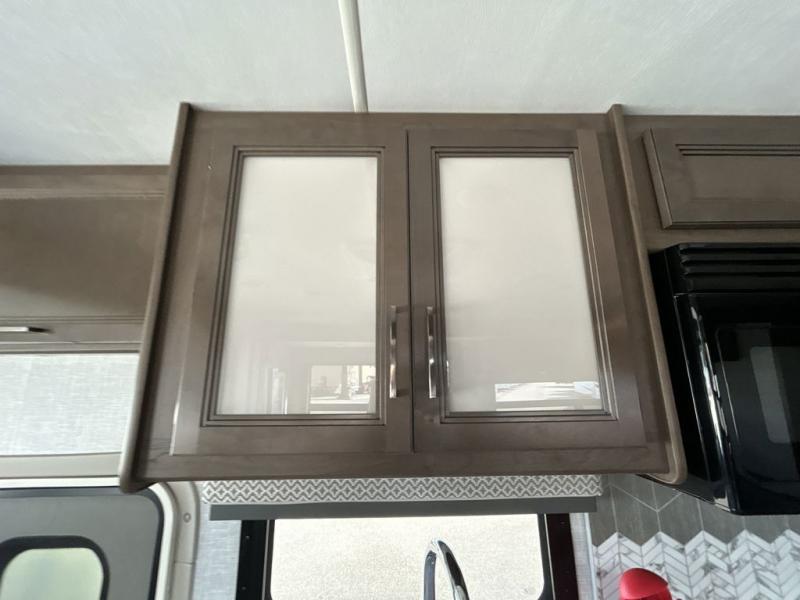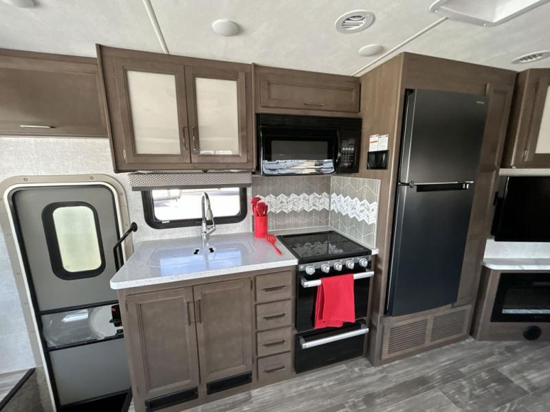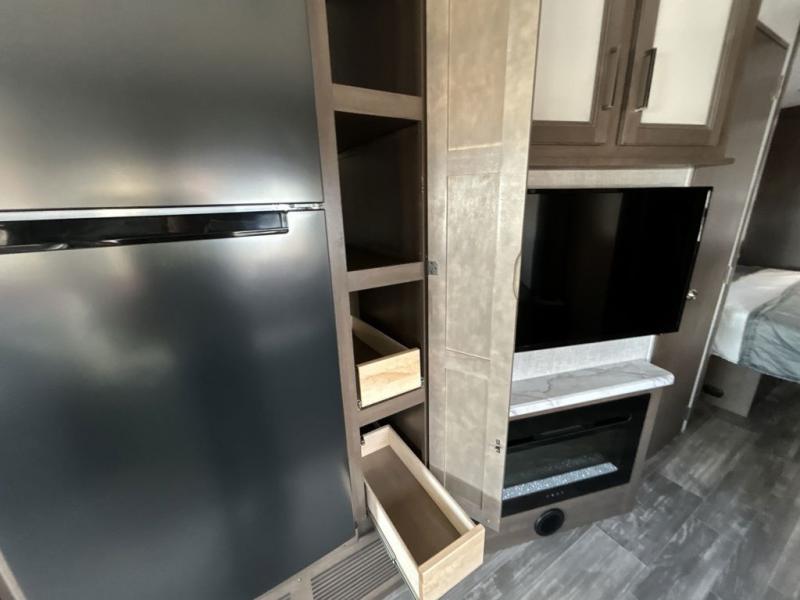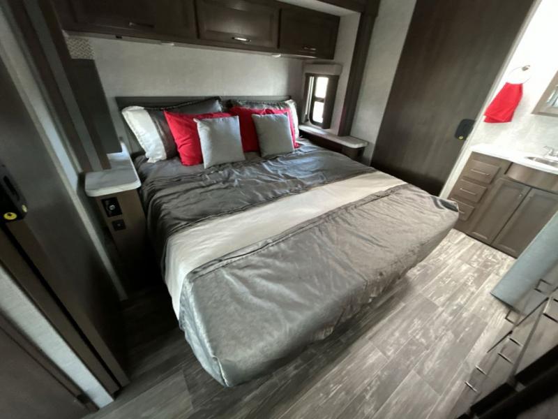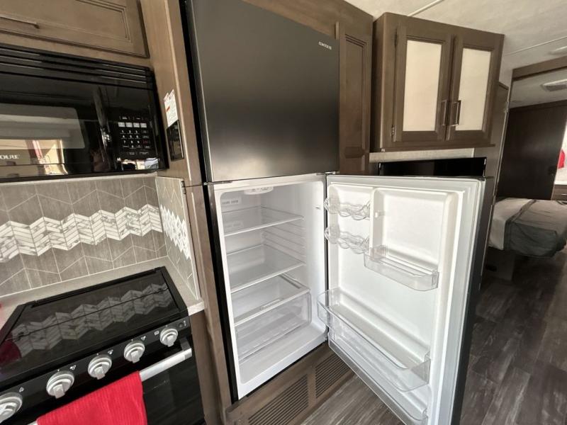 A bath and a half in this coach make it perfect for trips with friends and family. You will have tons of space provided by the two slide outs, plus a sleeping capacity of six to seven people each night. The expanding sofa bed has a great view of the 39" TV, and the Dream Dinette will be great for meals times and game night. Whip up a hearty meal on the three burner gas cooktop, or use the convenient over-the-range microwave oven. There is also a 12 cu. ft. residential refrigerator and a pantry for food storage. You'll be very pleased with the master bedroom that includes a king bed, a 32" TV, and a closet to keep your clothes wrinkle-free. There is even a second closet with stackable washer and dryer prep to make life on the road easier than ever.